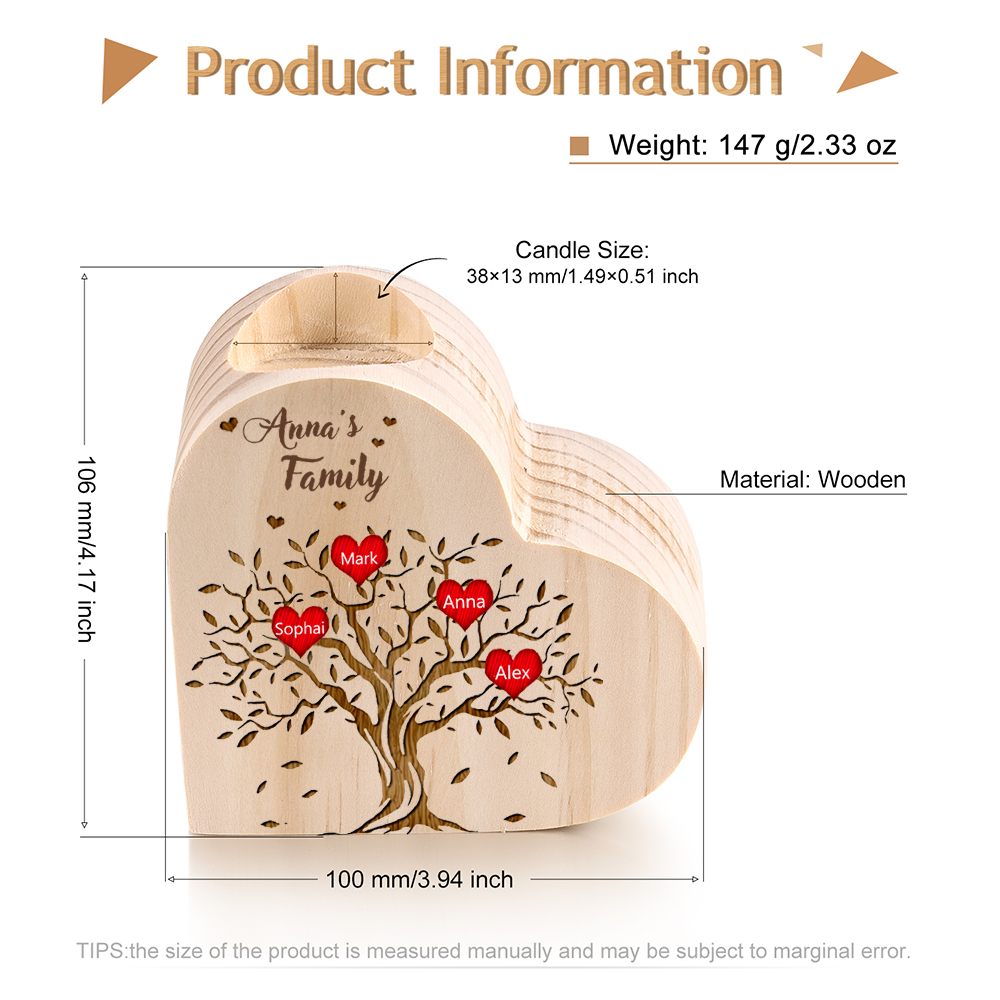 To My Family Wooden Heart Candle Holder Custom 4 Names Family Tree Candlesticks