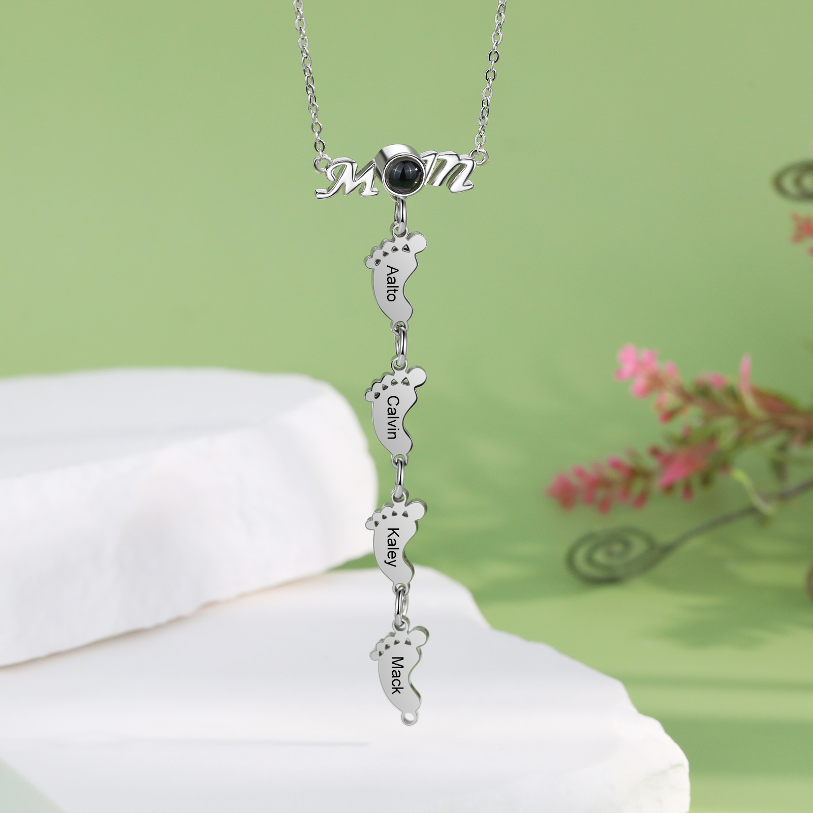 Mother Baby Feet Projection Necklace Engrave 4 Names Personalized Photo Necklace Creative Gifts
