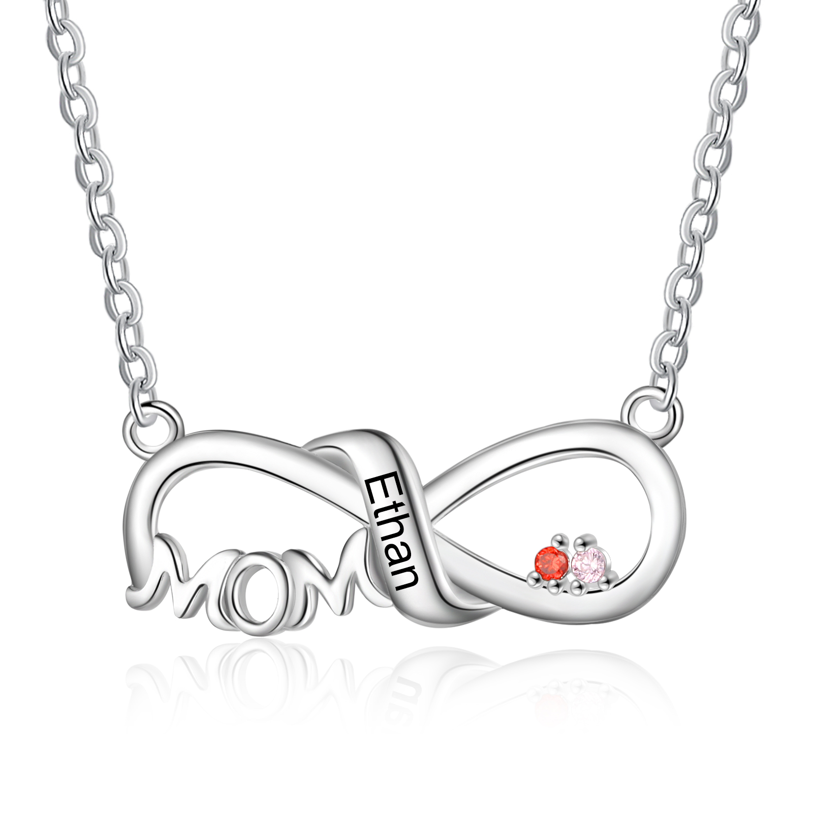 Custom Mom Infinity Necklace with 2 Birthstones Engrave 1 Name