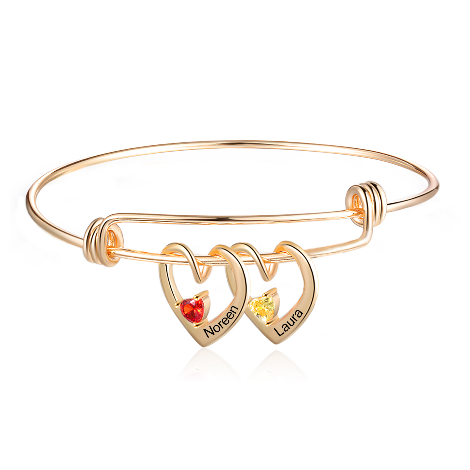 Heart Pendants Bangle Bracelet with 2 Names and Birthstones Gifts for Mom