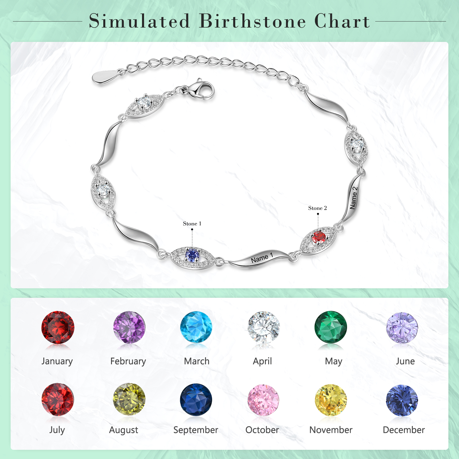 Personalized Infinity S925 Bracelet with 2 Birthstones Engraved Names