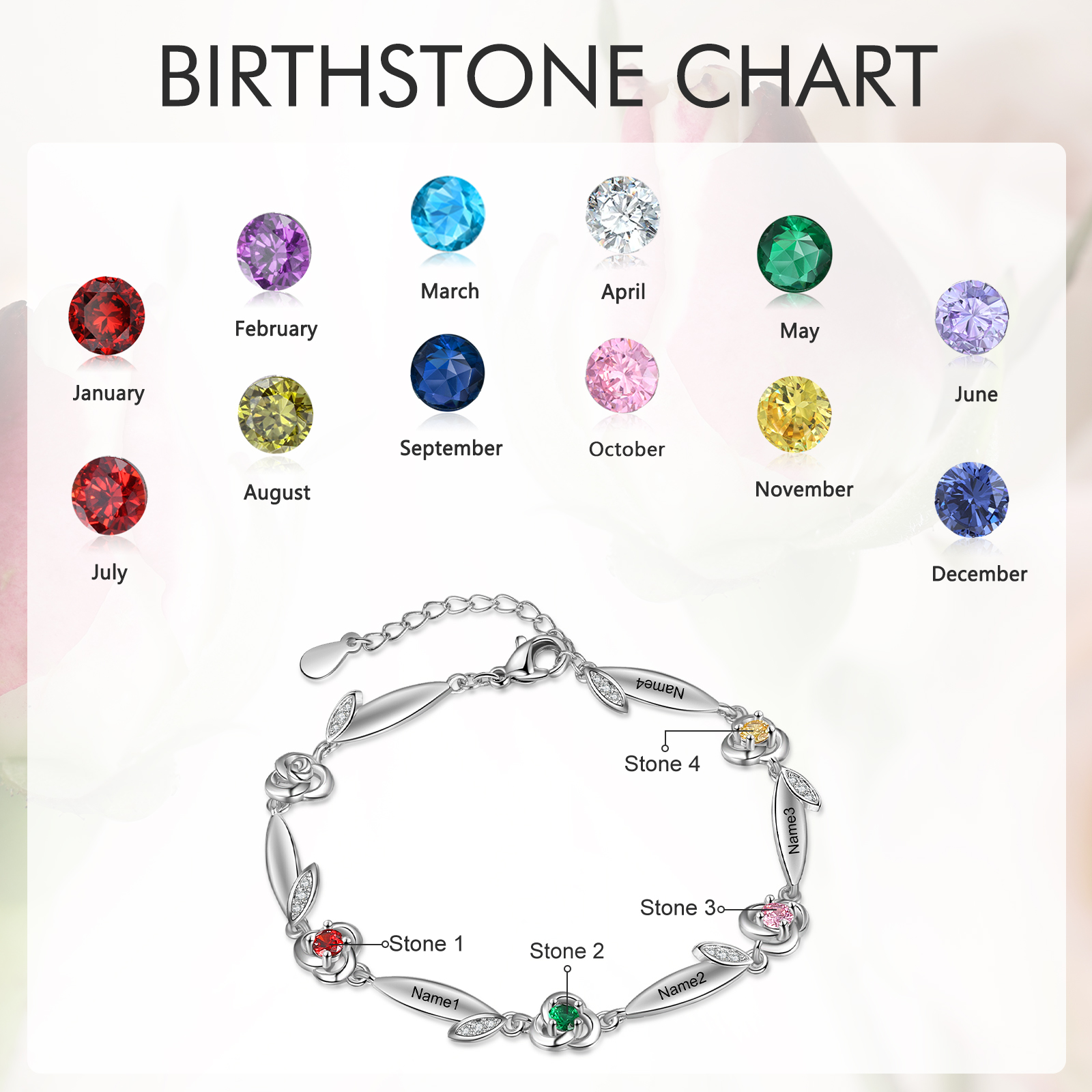 Personalized Rose Birthstone Bracelet Custom 4 Names Bracelet for Her