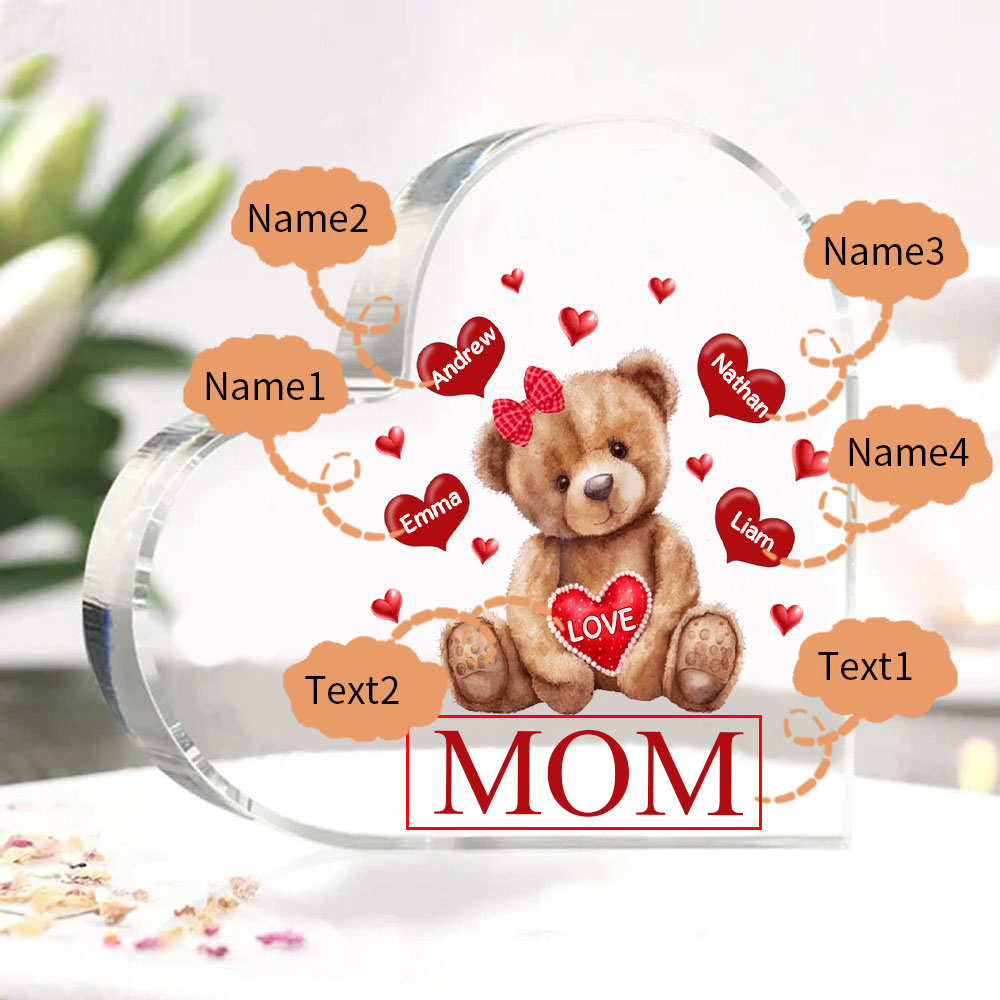 4 Names - Personalized Acrylic Heart Keepsake Custom 2 Texts Teddy Bear Ornaments Gifts for Grandma/Mother