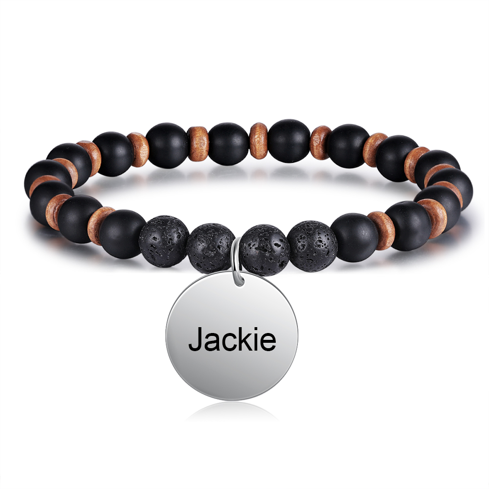 Personalized Men Bracelet Engraved 1 Name Black Onyx Beaded Bracelet