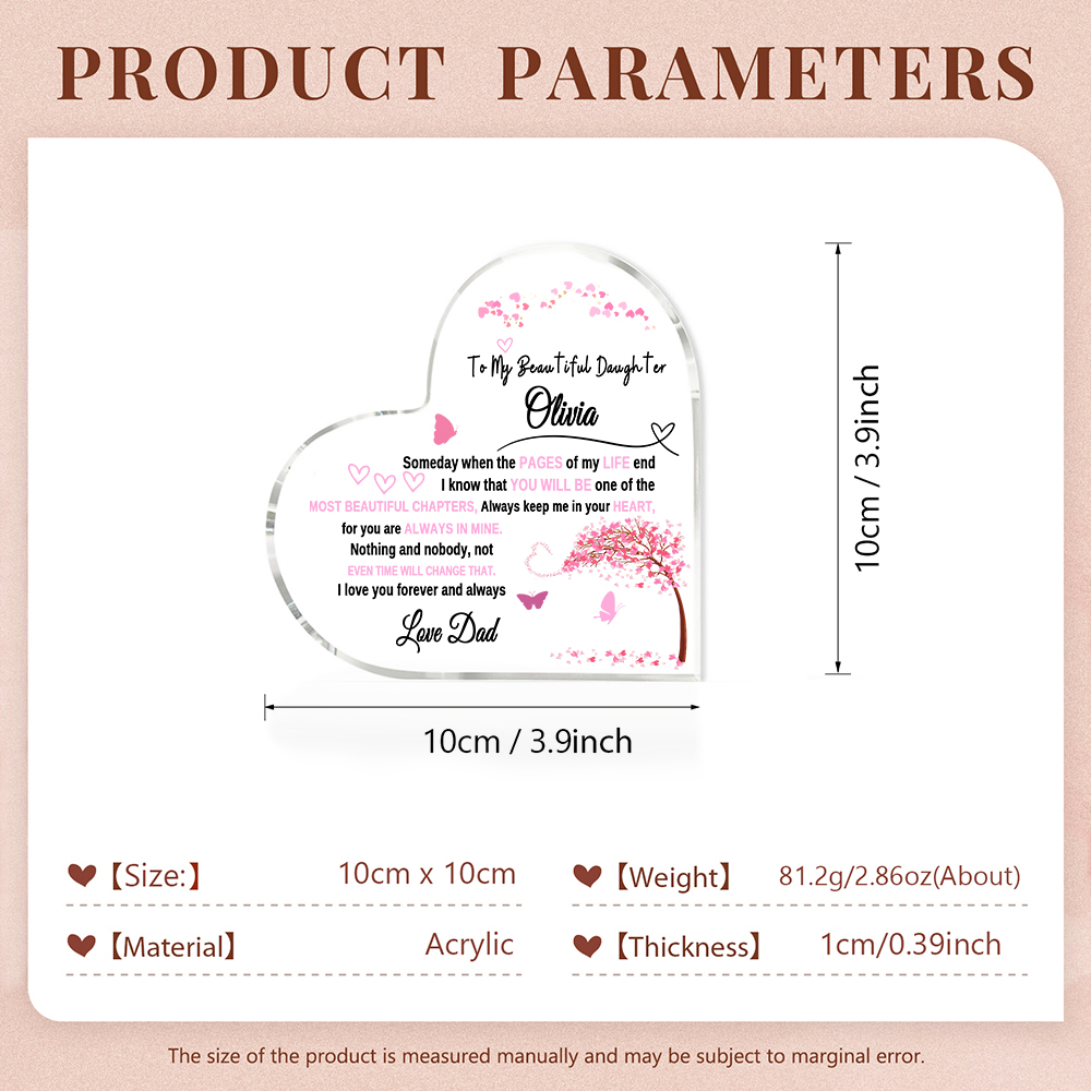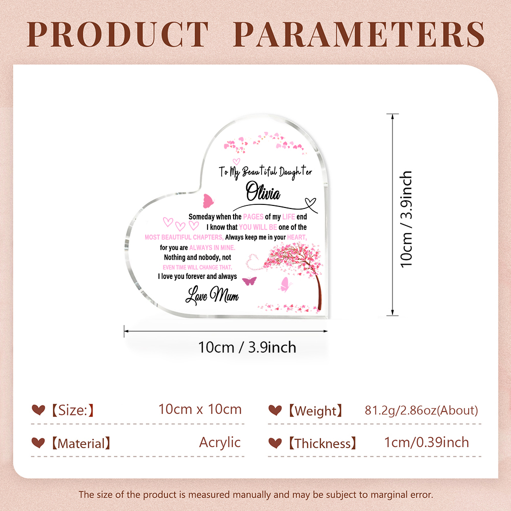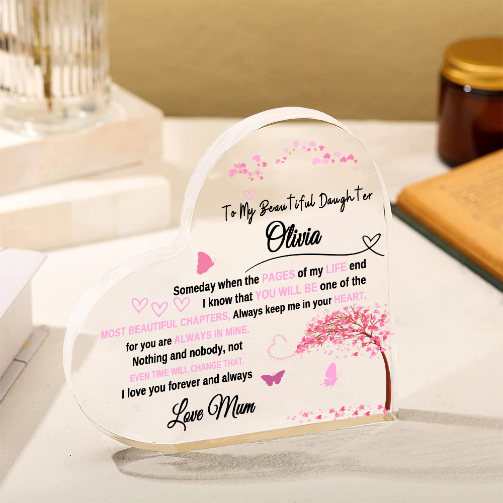 To My Daughter Acrylic Heart Keepsake Custom 1 Name Plaque Ornament - Someday When The Pages Of My Life End I Know That You Will Be One Of The Most Beautiful Chapters