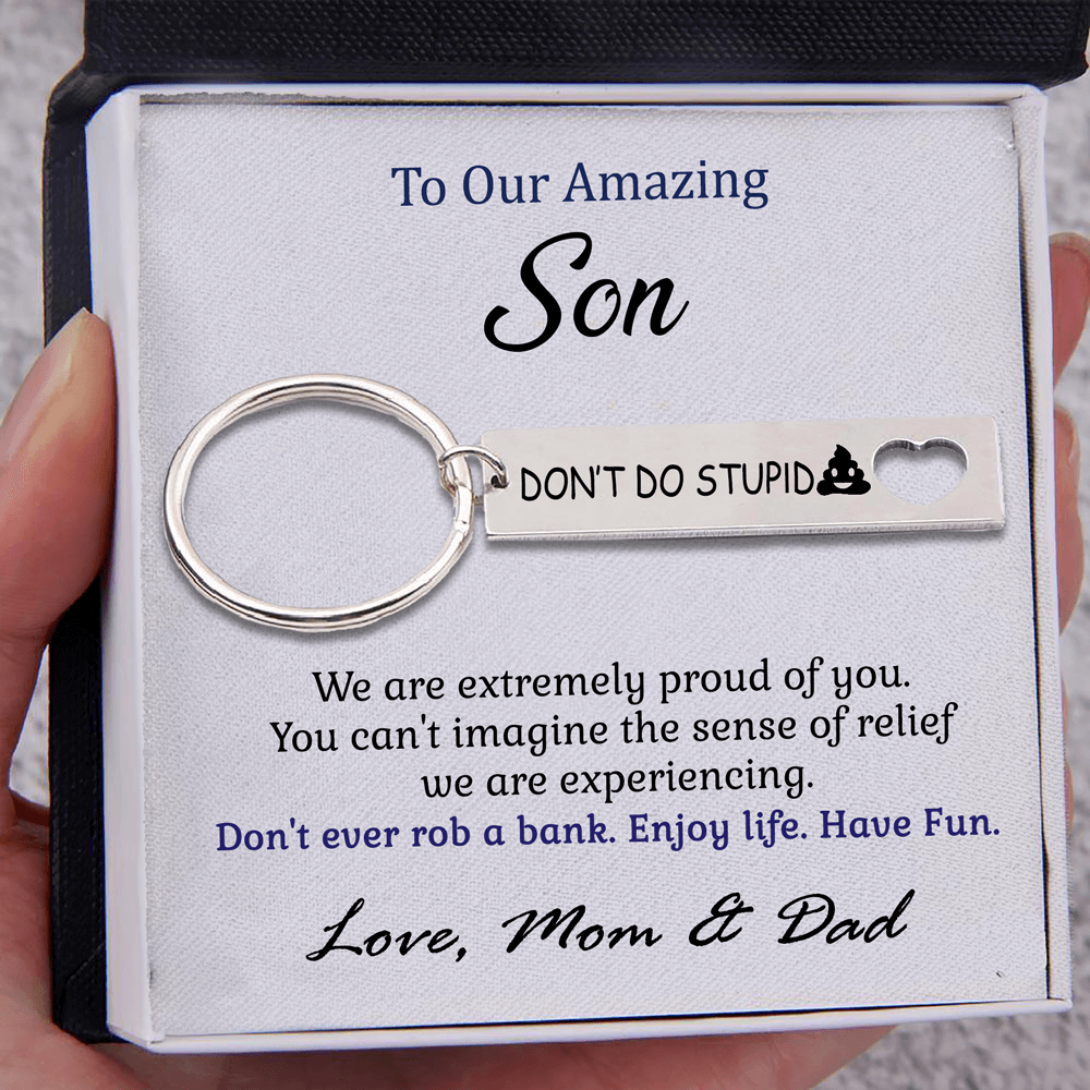 To Our Son Don't Do Stupid Love Mom & Dad Keychain "We're Extremely Proud of You"
