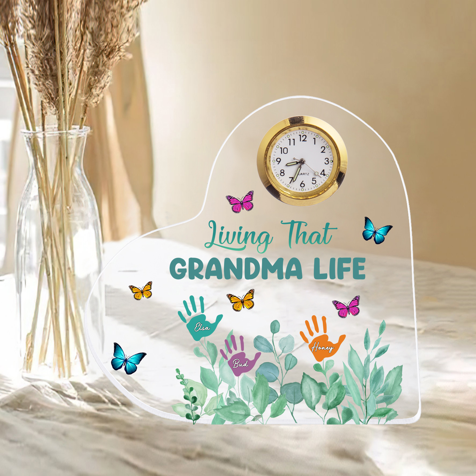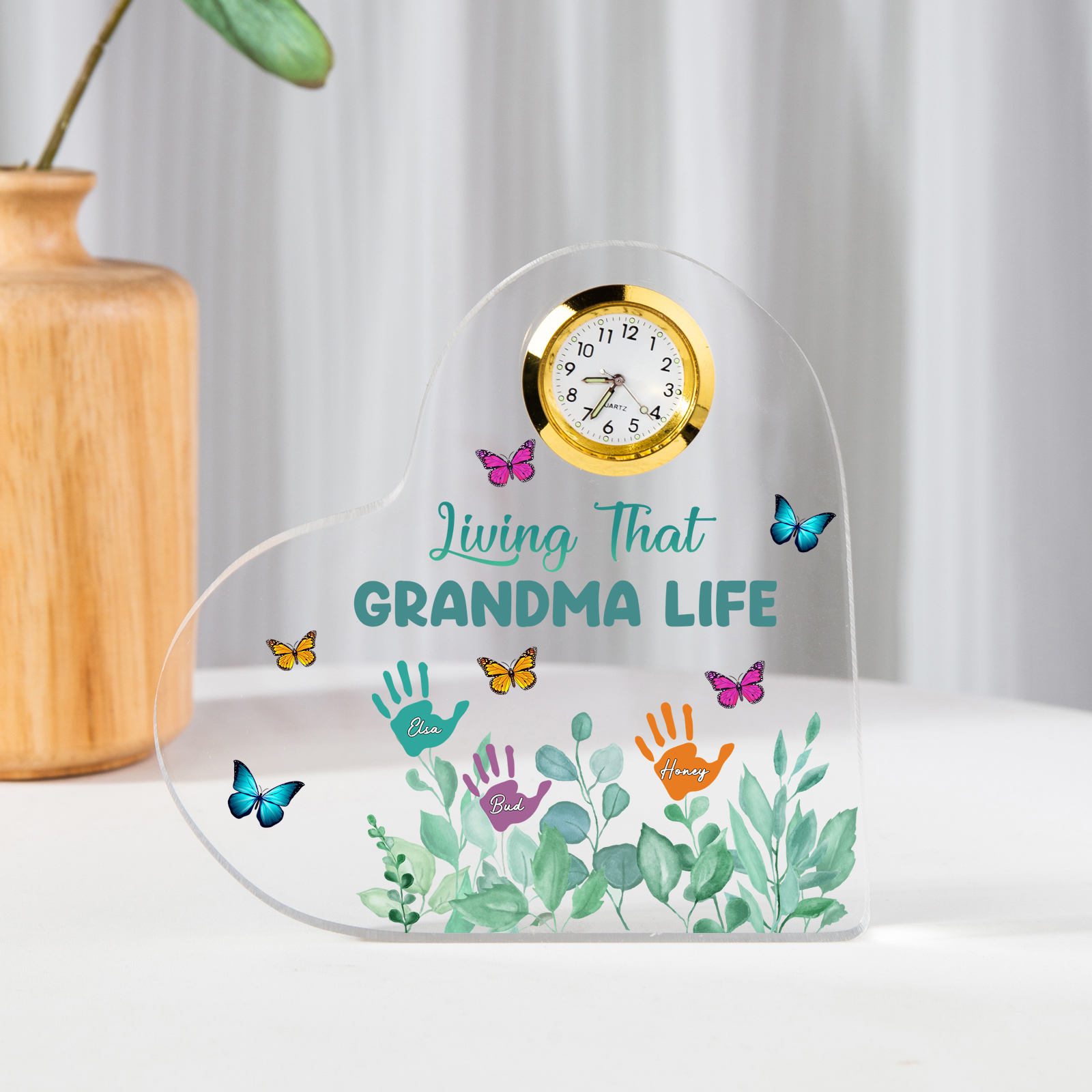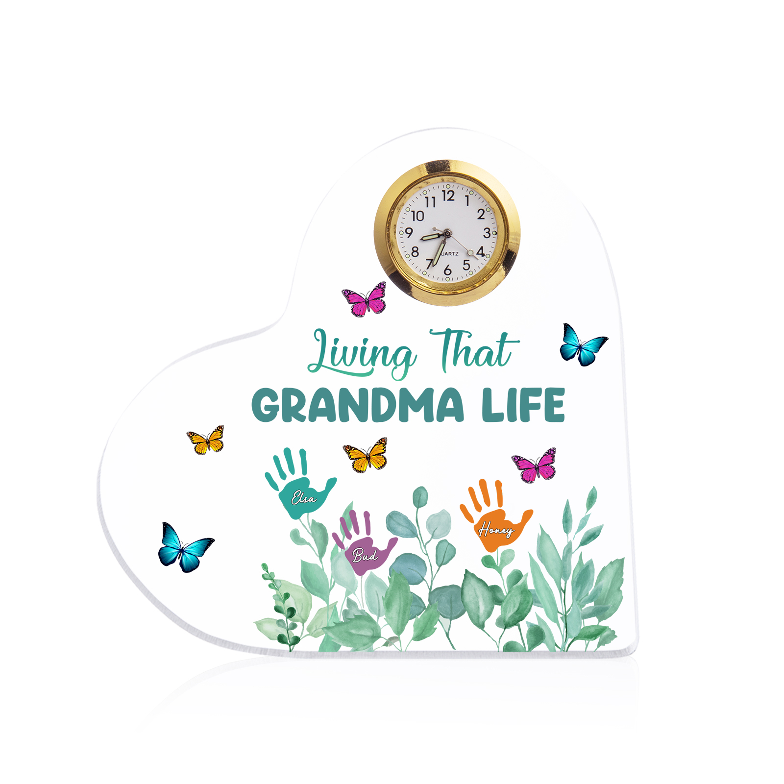 Personalized Heart-Shaped Acrylic Clock Keepsake Engraved 3 Names Heart Butterfly Ornament Grandparents' Day Gift for Mom Grandma