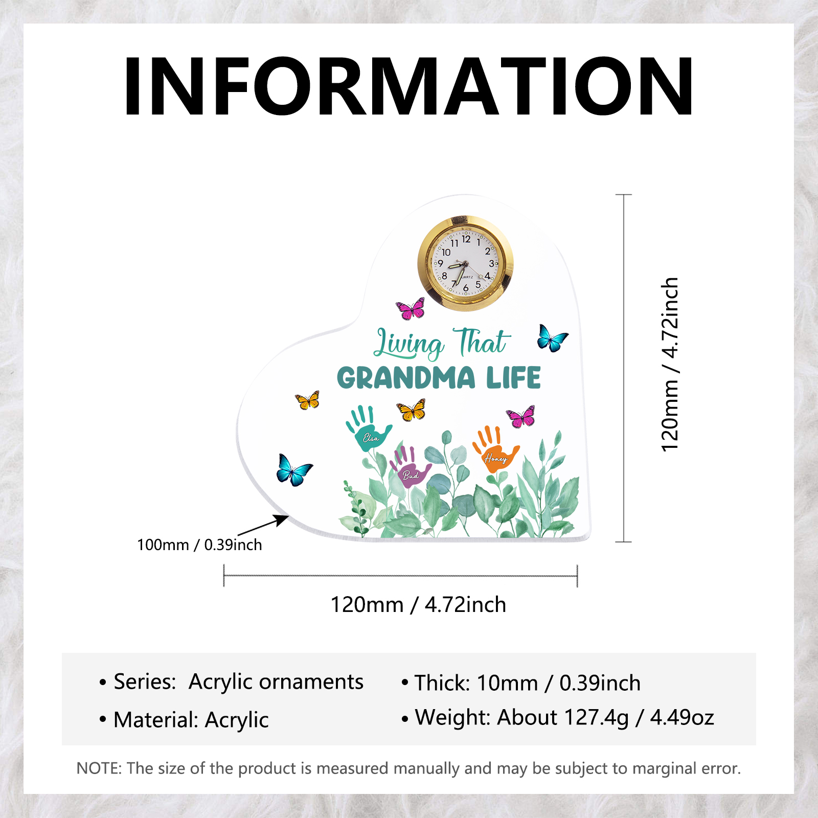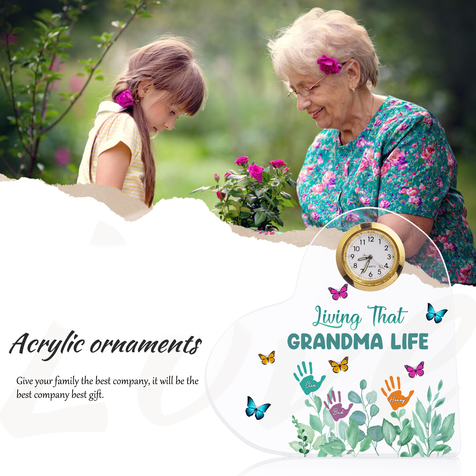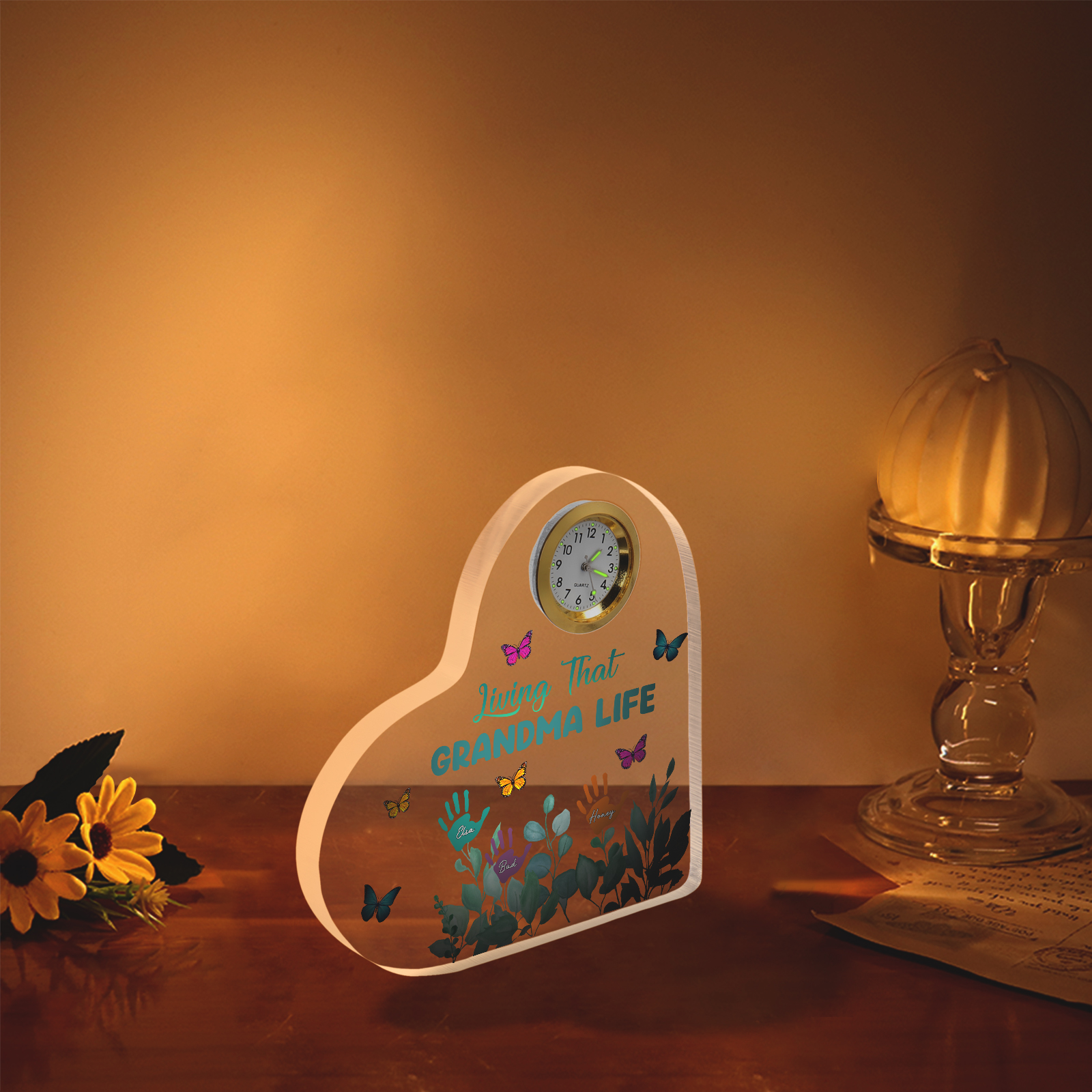 Personalized Heart-Shaped Acrylic Clock Keepsake Engraved 3 Names Heart Butterfly Ornament Grandparents' Day Gift for Mom Grandma