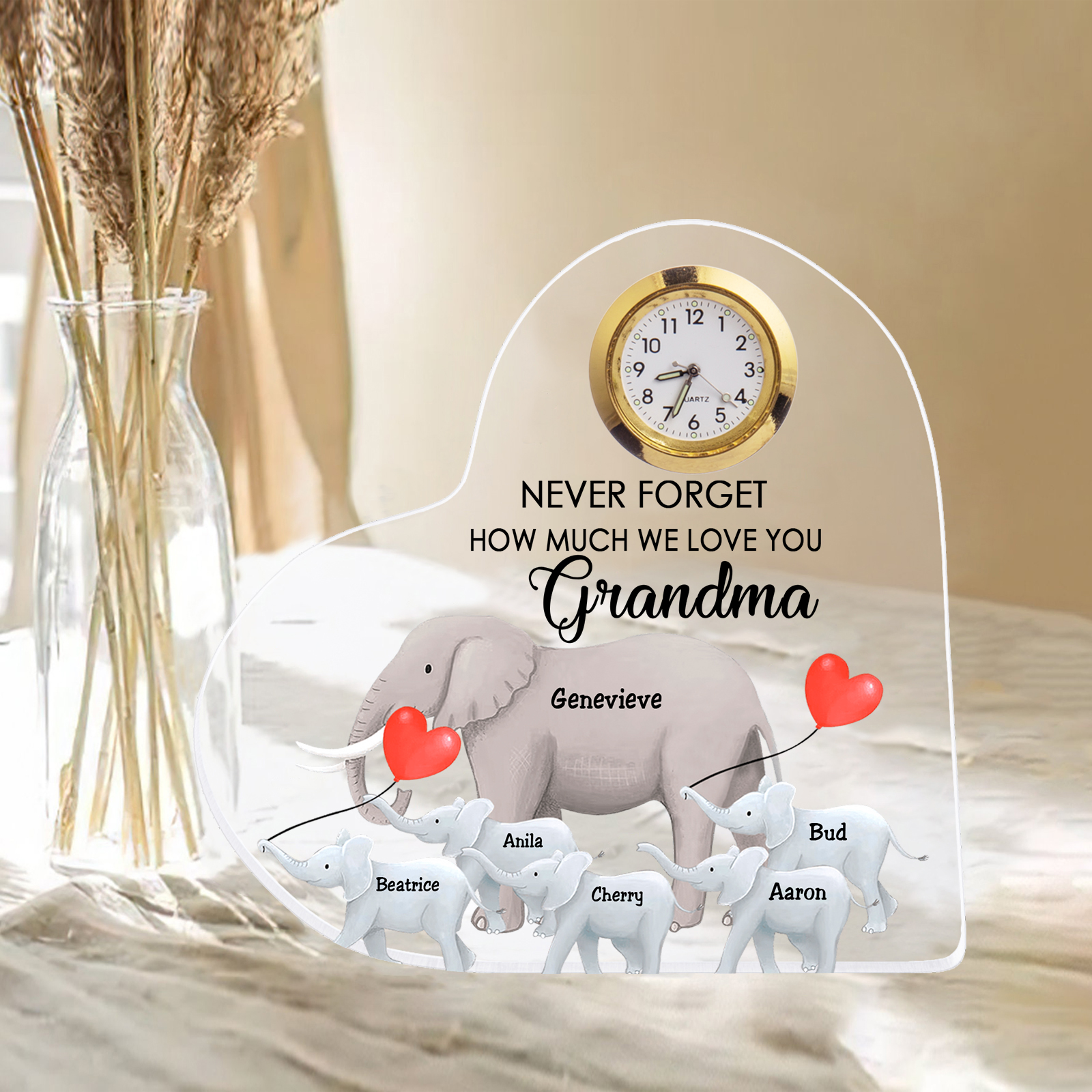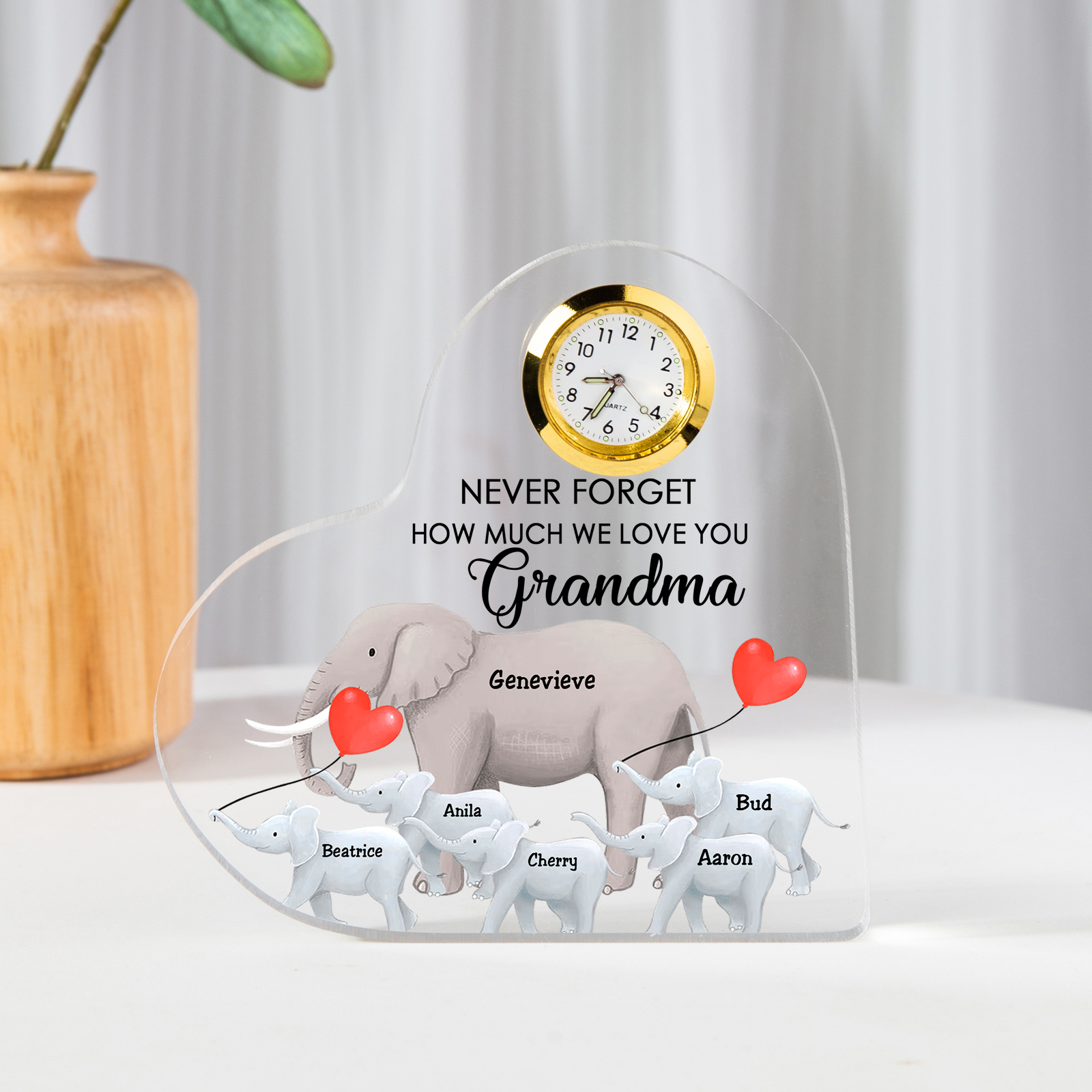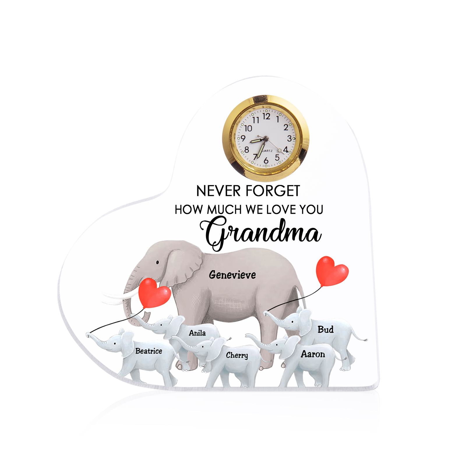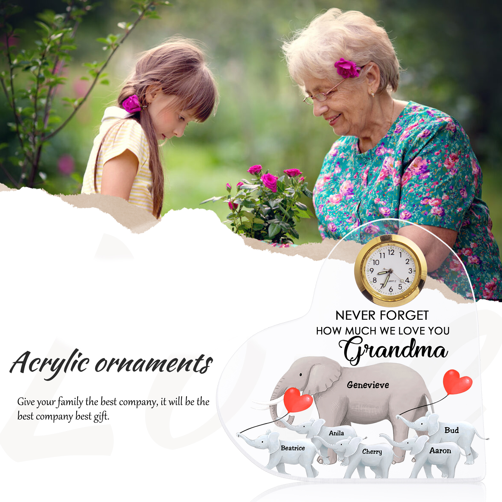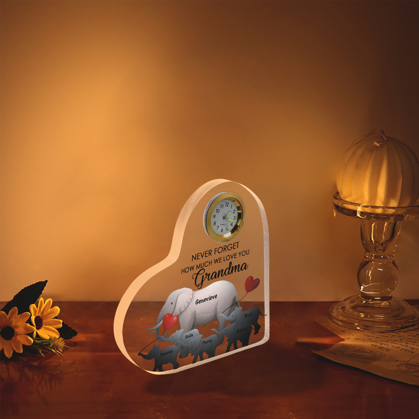 Personalized Heart-Shaped Acrylic Clock Keepsake Heart Sign Engraved 6 Names Elephant Ornament Unique Gift for Mom Grandma