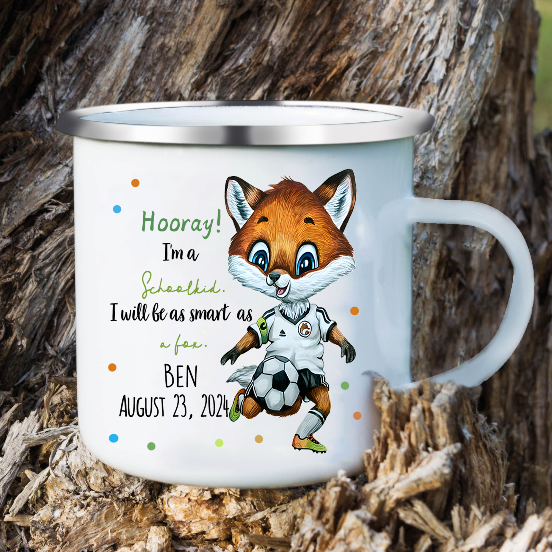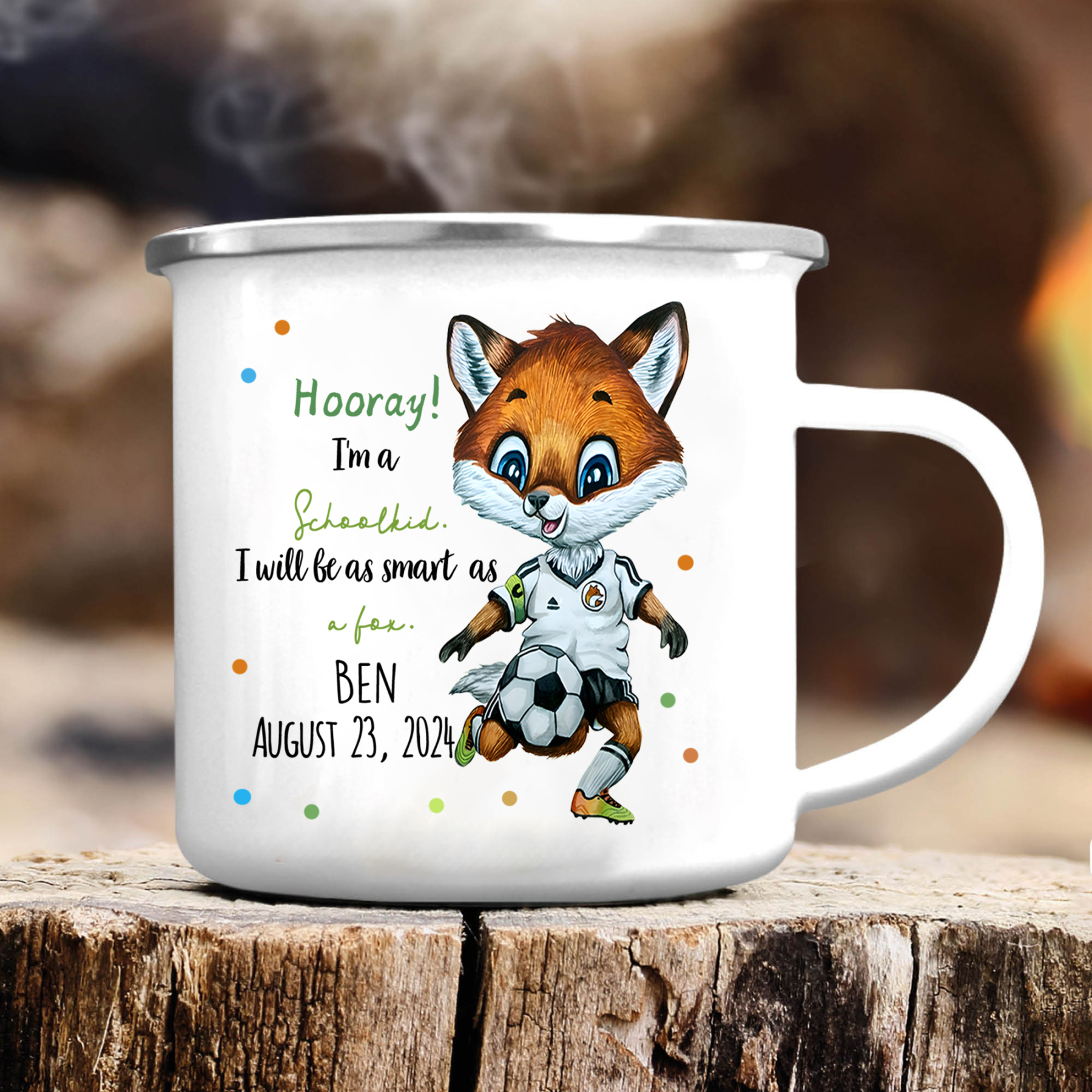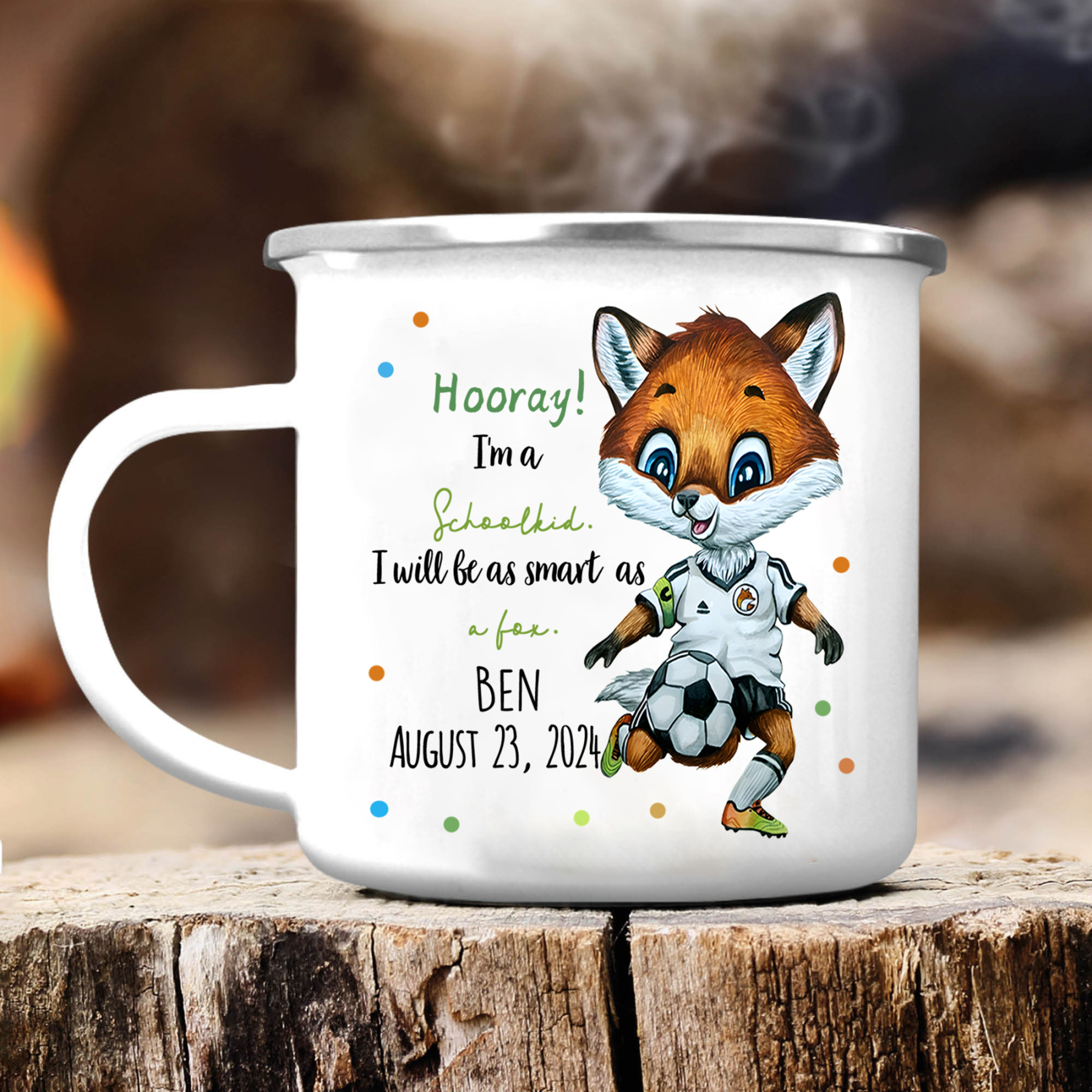 Personalized Name & Date Enamel Mug Back-to-School Gifts - Hooray! I'm A Schoolkid. I Will Be As Smart As A Fox