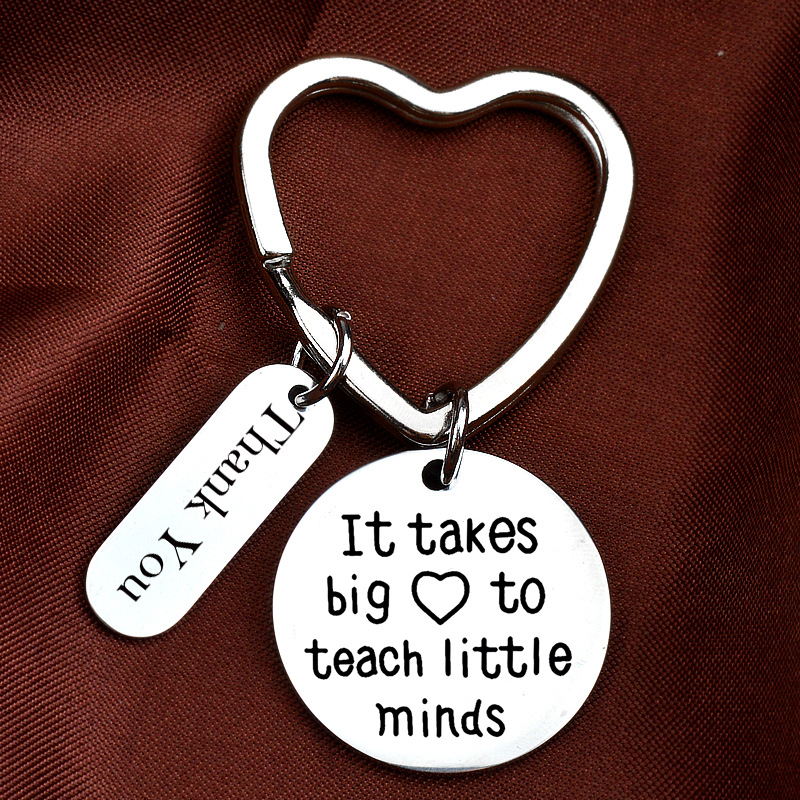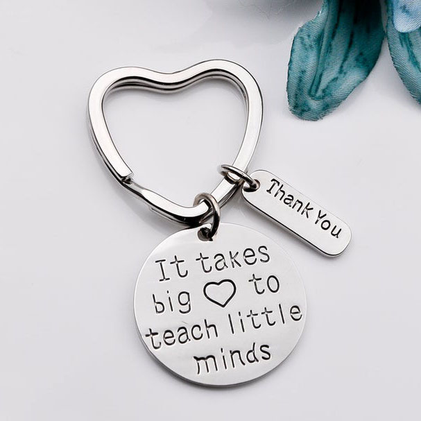 The personalized keychain engraved with "It takes a big heart to teach little minds" would be a great gift for your teachers. Show them you appreciate their hard work with this little thoughtful gift. It is a gift idea for a teacher, pre-school teacher, or nursery worker at the end of the term or back to school.