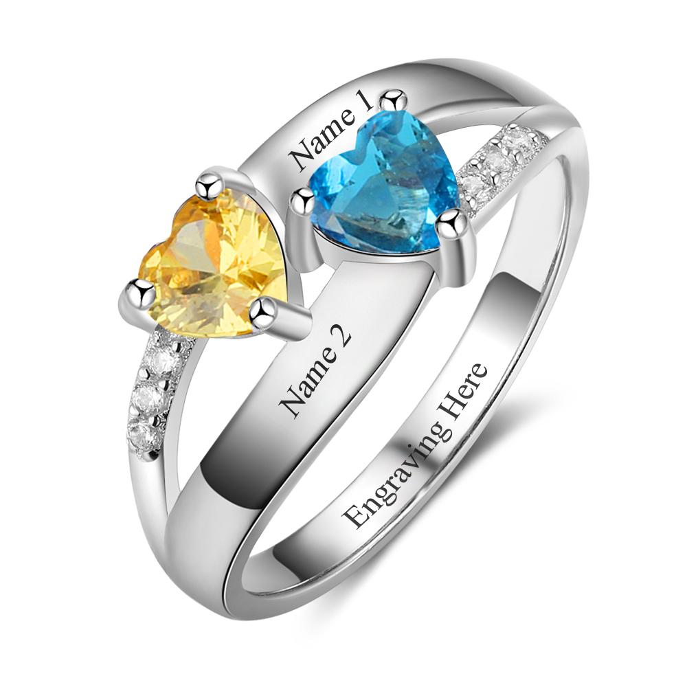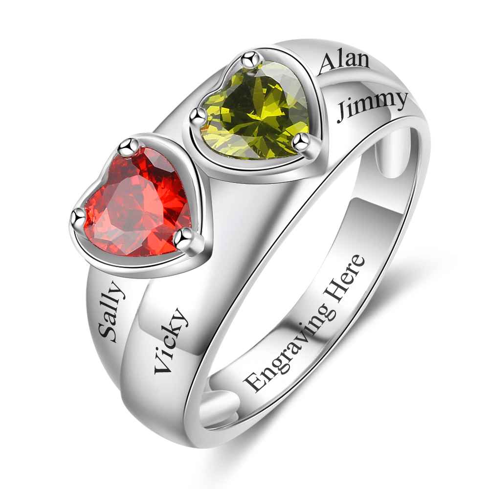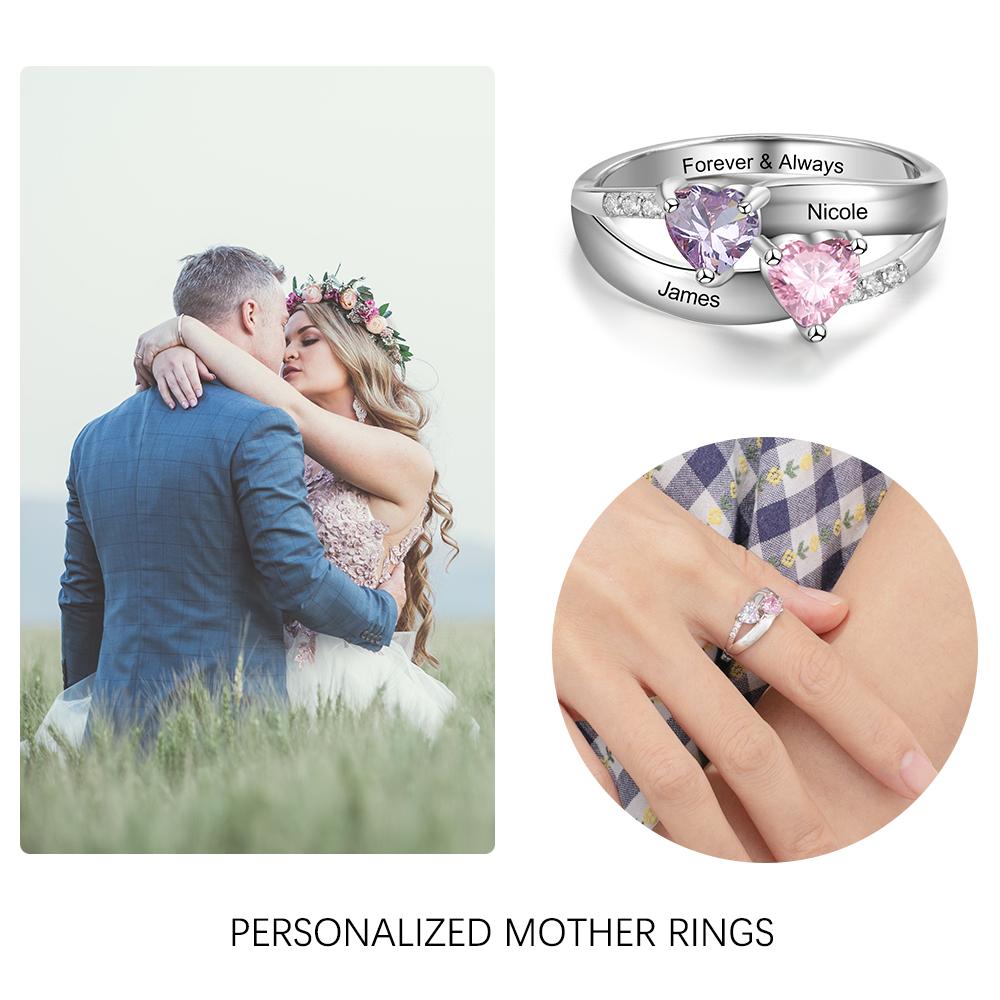Mother Ring with 2 Heart Birthstones Engraved 2 Names Promise Ring Personalized Couple Ring