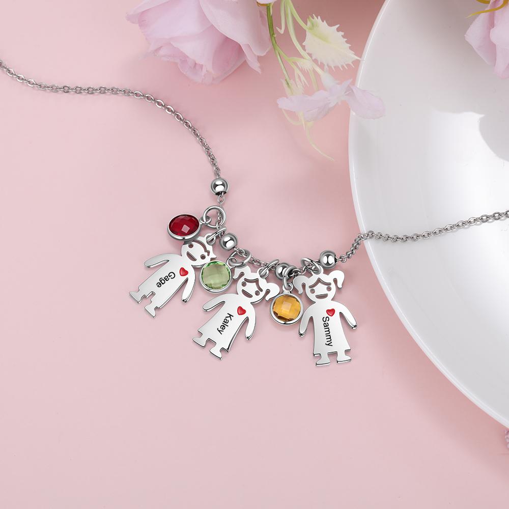 Birthstone Mother Necklace with Kid Charms and Engraved 3 Names