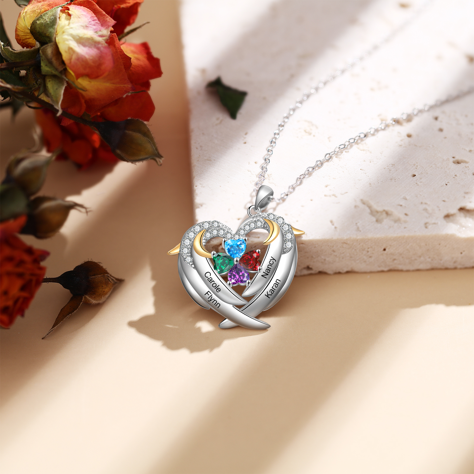 Personalized Heart Angel Wings Necklace with 4 Birthstones