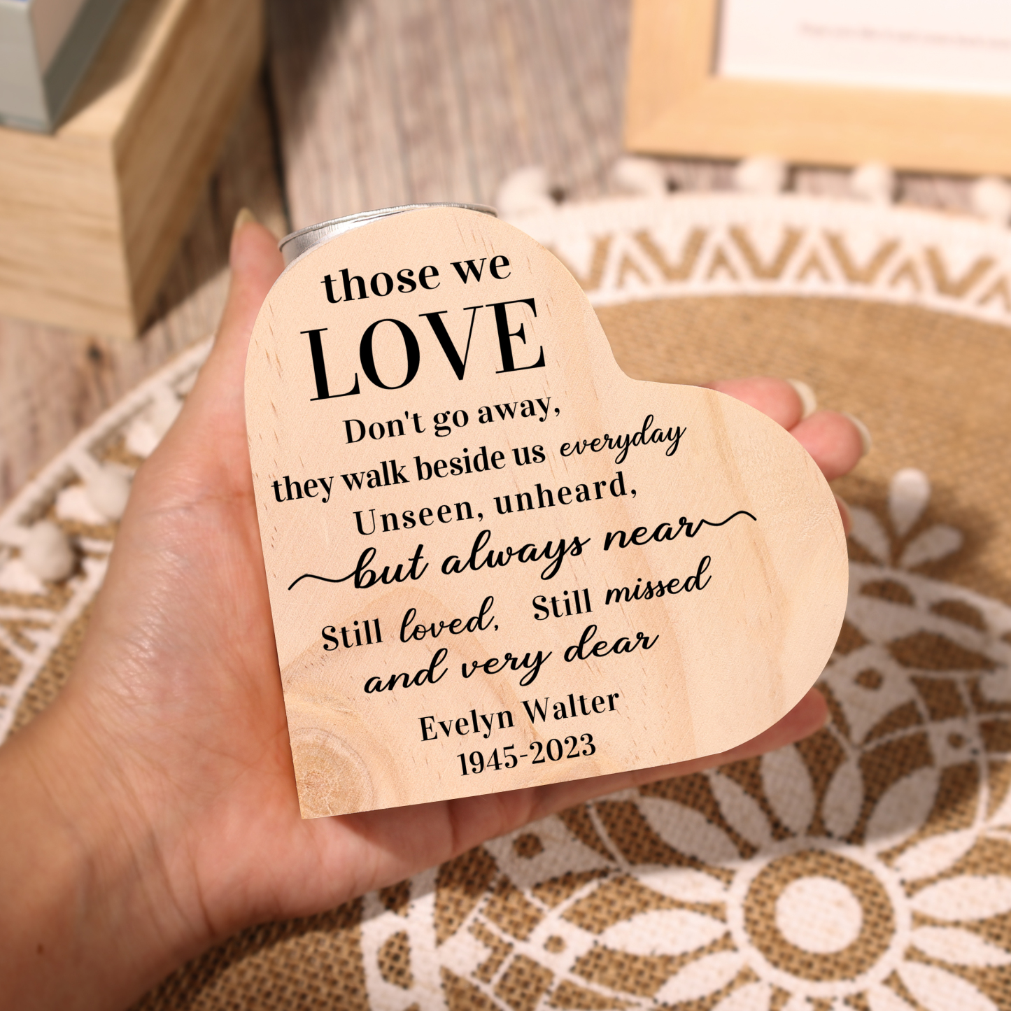 🕯️ This personalized wooden heart-shaped memorial candle holder is both a beautiful decoration and a heartfelt memorial gift. It is designed to honor the memory of your departed loved ones, allowing you to customize their name, birth year, and year of passing. Whether used as part of a memorial ceremony or as a special decor, this candle holder brings warmth and solace.