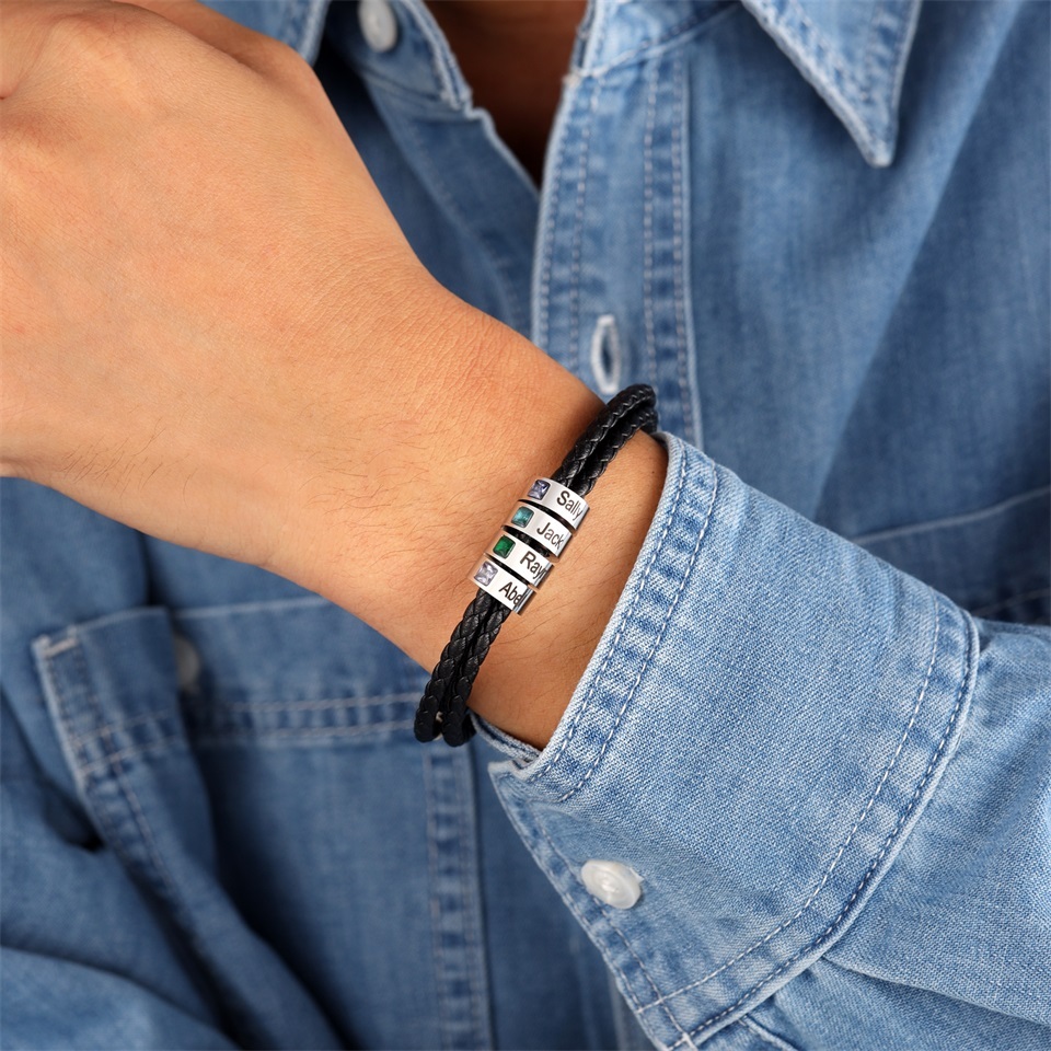 Personalized Mens Leather Bracelet 4 Beads with Birthstones