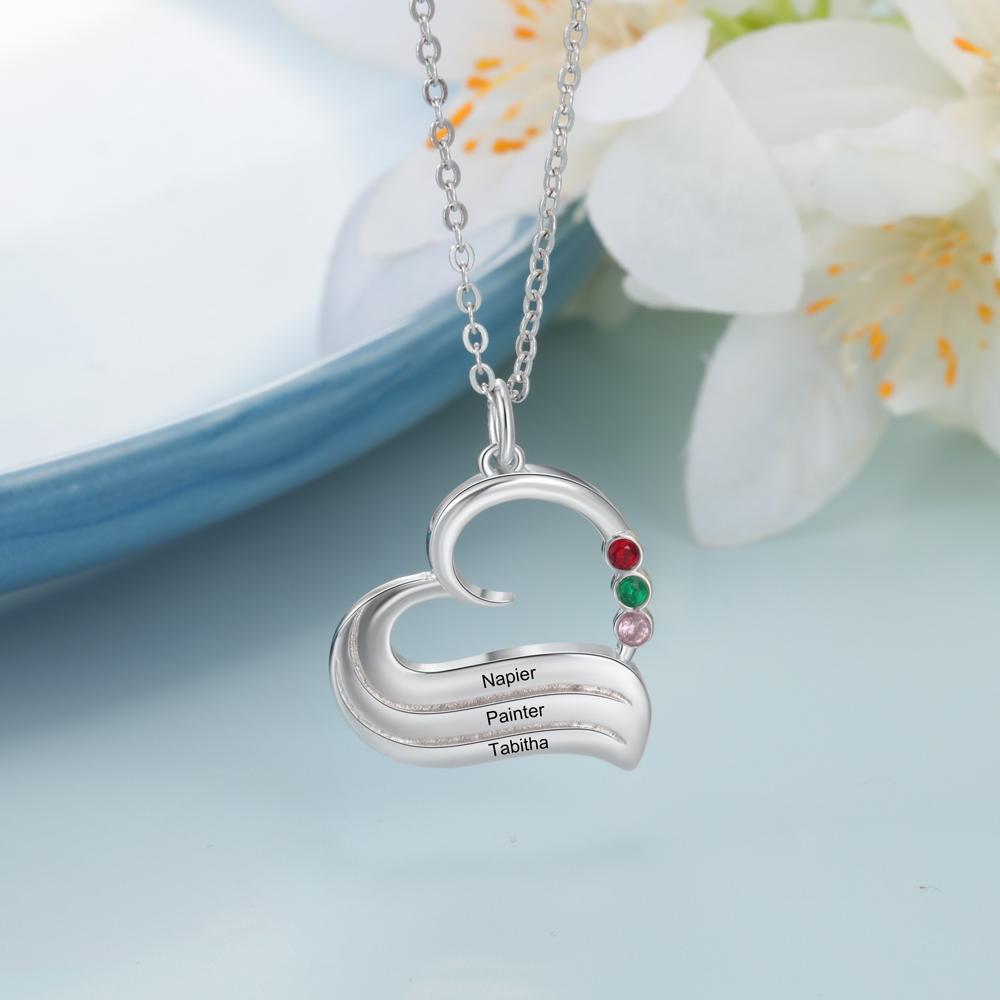 Heart Pendant Necklace with 3 Birthstones Engraved 3 Names