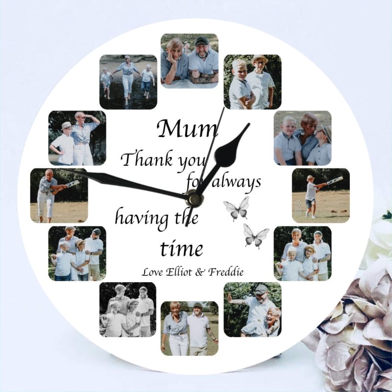 This custom clock is a good idea to display images of family vacations, pets, weddings, special events, professional or hobby photo shoots.