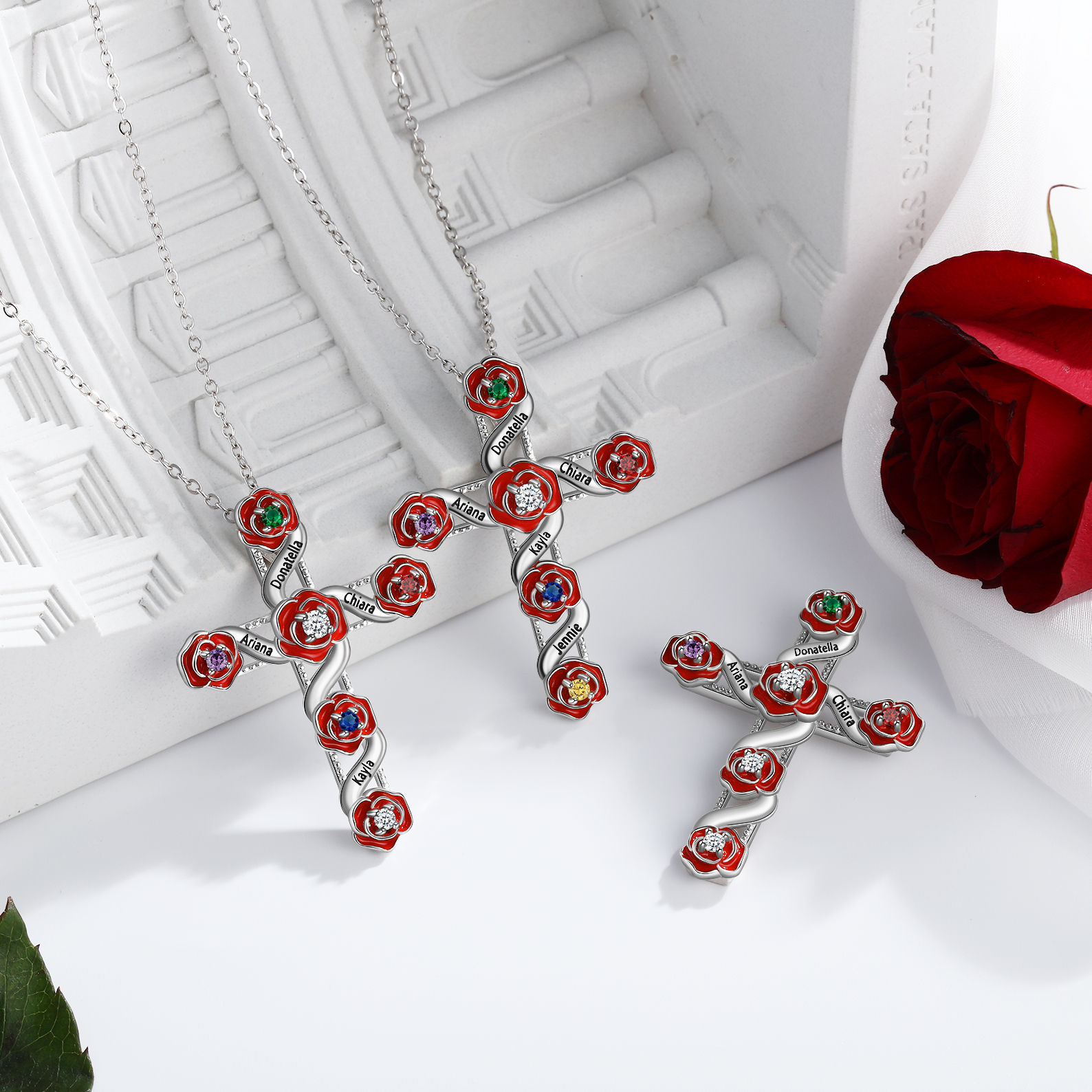 Personalized Rose Cross Necklace with 4 Birthstones Engraved Names for Her