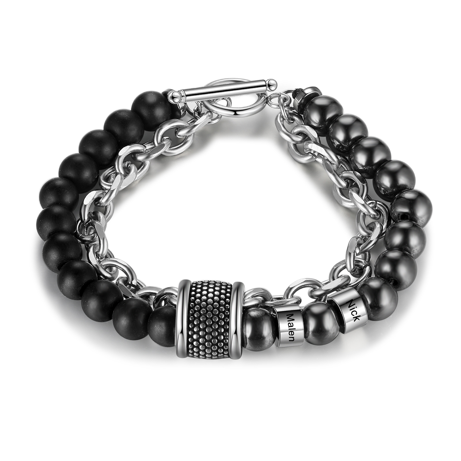 Father's Day Personalized Black Onyx Bracelet with 3 Names Beaded Men Bracelet