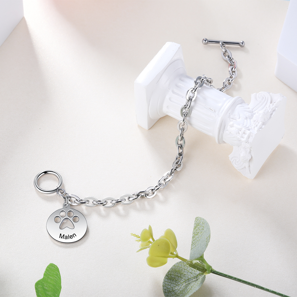 This custom paw print bracelet makes the perfect gift for pet lovers. Engrave your pet's name on a charm and keep them close to your heart. The delicate yet stunning design makes it perfect for everyday wear. It makes the perfect birthday gift or as a memorial piece.