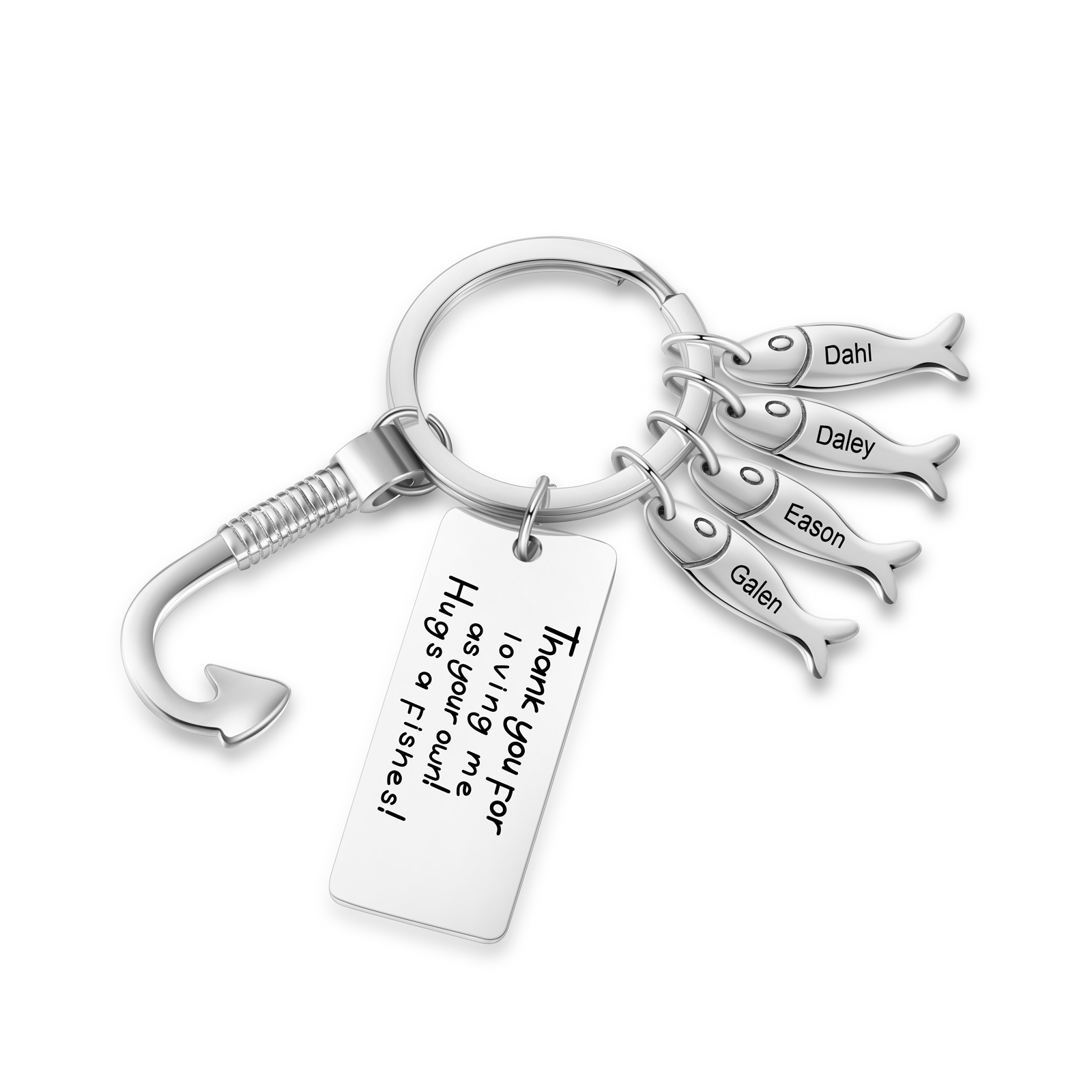 Personalized Fishing Hook Keychain Engraving 4 Names Keychain Silver Gift for Men