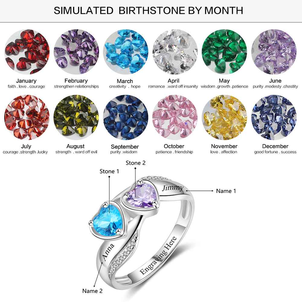Rival 2 Hearts Birthstone Ring with 2 Stone Engraved 2 Name Mothers Ring