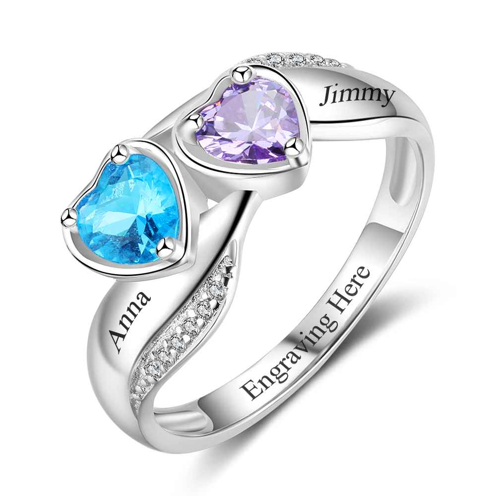 Double Heart Birthstone Promise Ring Personalized with 2 Stones Engrave 2 Names Custom Mother Ring