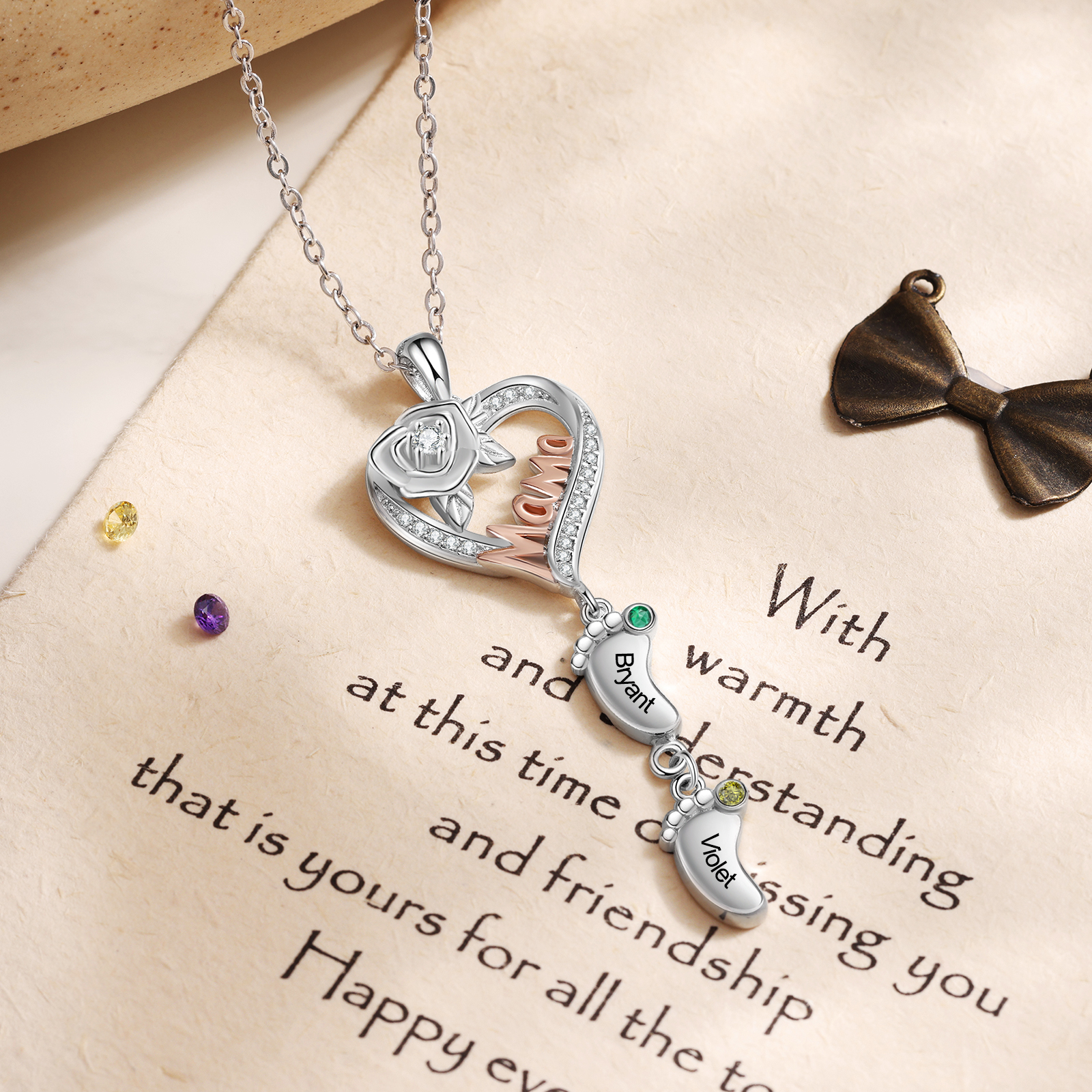 Personalized Mama Rose Necklace Custom 2 Names Baby Feet Necklace