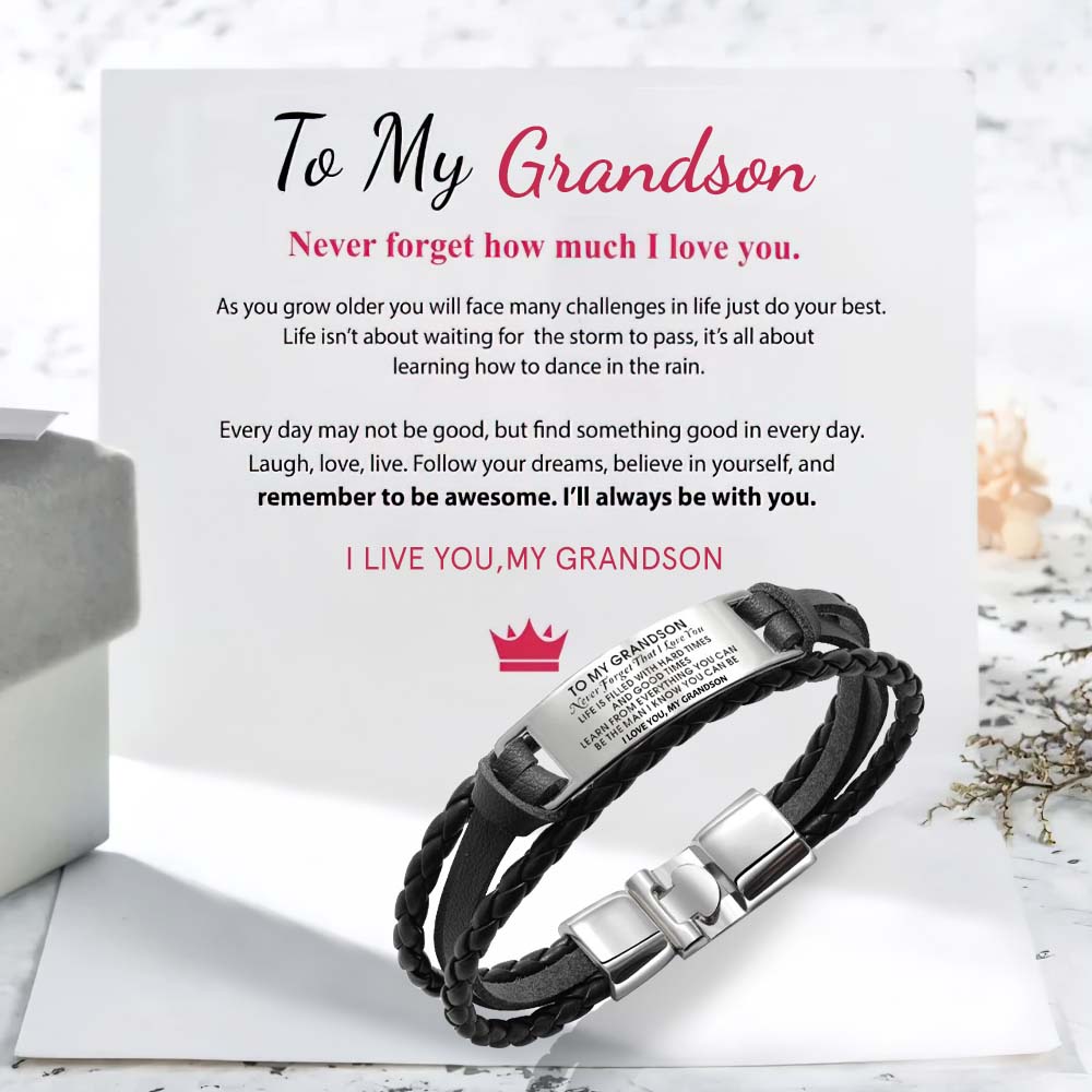 To My Grandson Steel & Leather Bracelet "Life Is Filled with Hard Times“