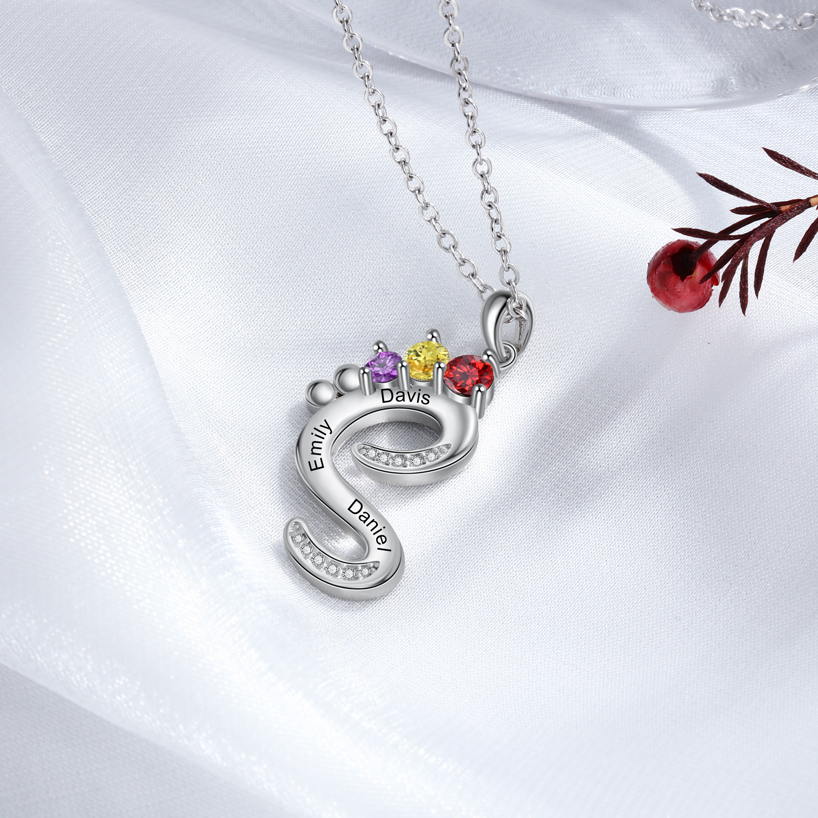 Baby Feet Necklace Custom 3 Birthstones and Names Gift for Mom