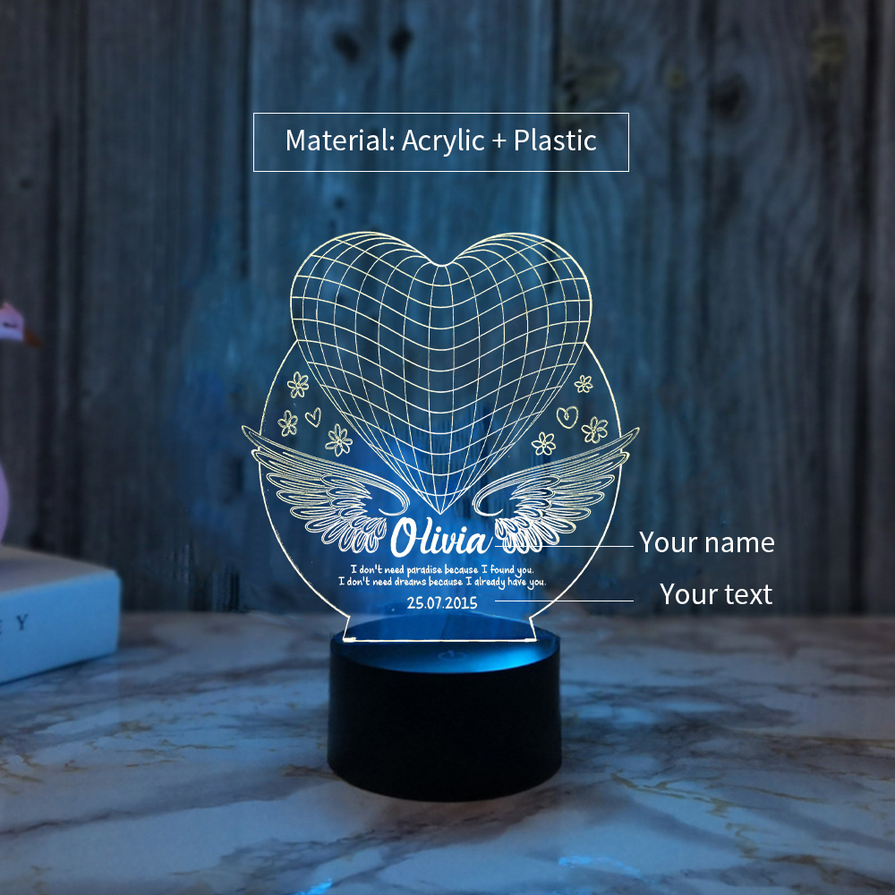 Personalized Heart Wing Night Light Custom Name 7 Colors LED Lamp for Couple