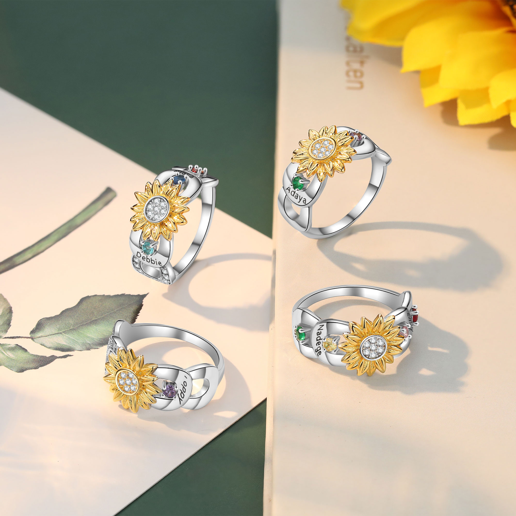 Customize Sunflower Ring with Birthstone Engrave 4 Names for Her