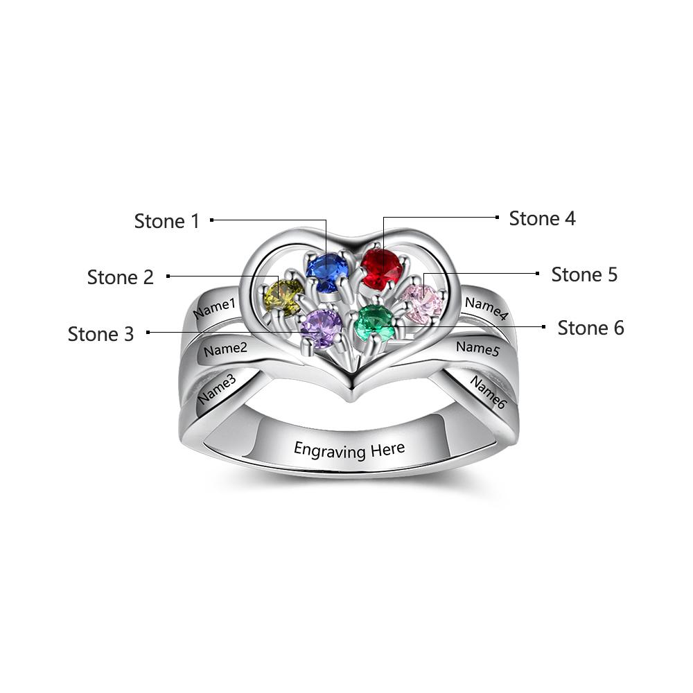 Personalized Heart-shape Mother Ring 6 Stones Engraved 6 Names Birthstone Mother's Day Ring
