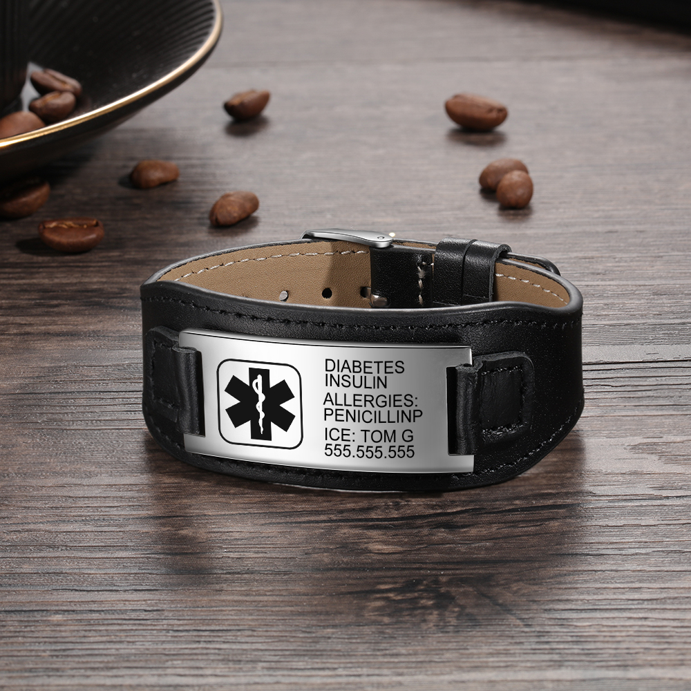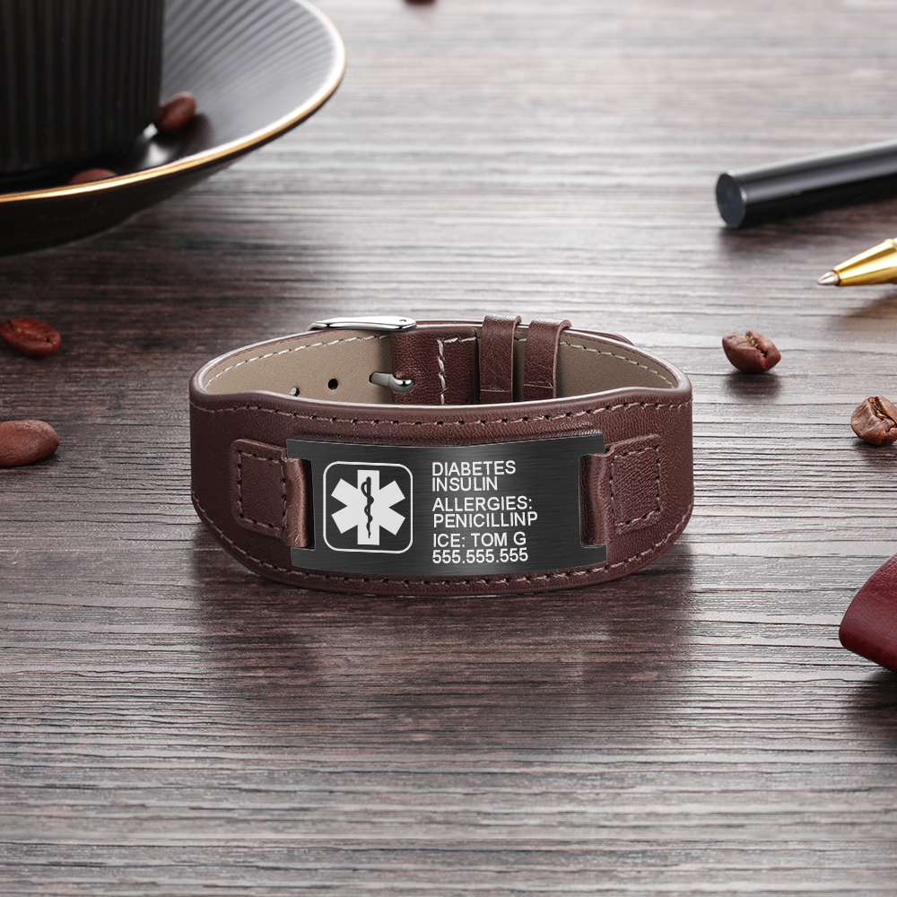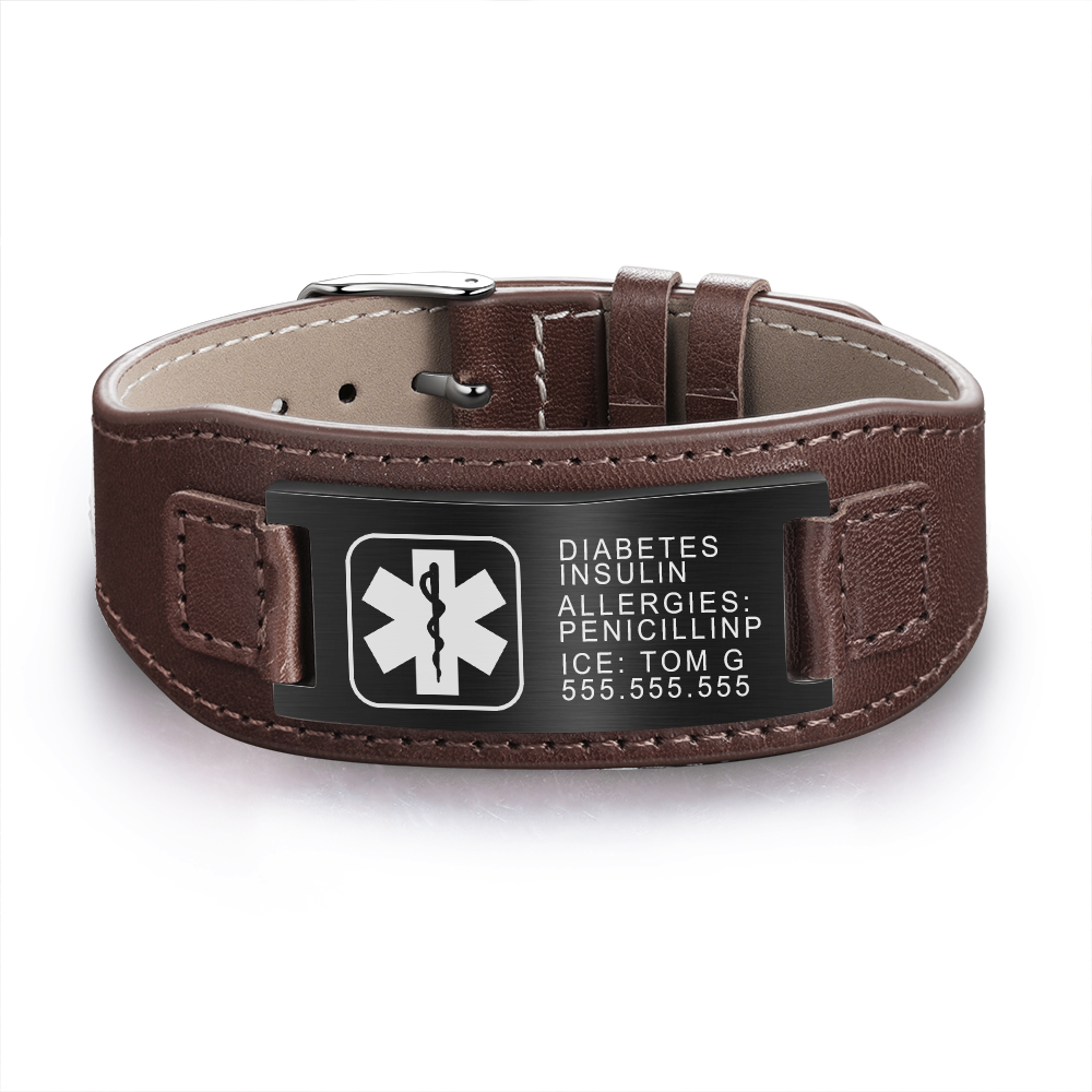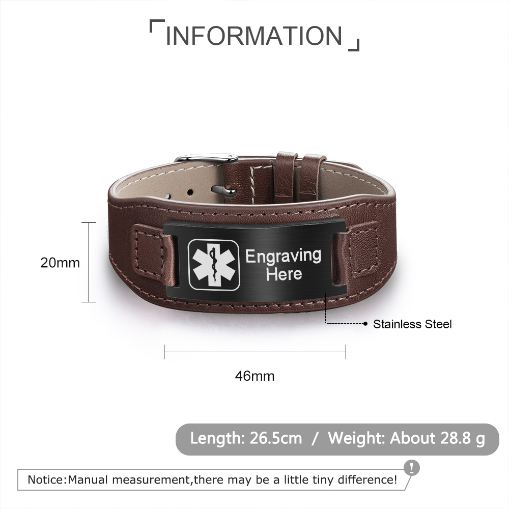 Personalized Leather Medical Alert Bracelet ID Wristbands Adjustable Custom Texts Emergency Bracelet