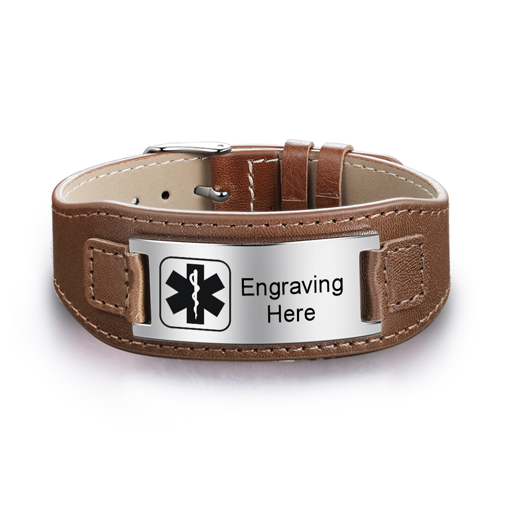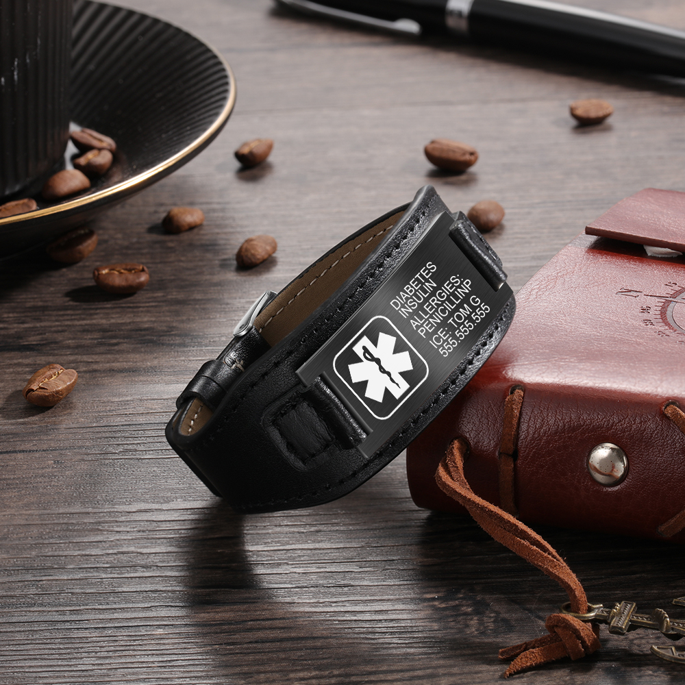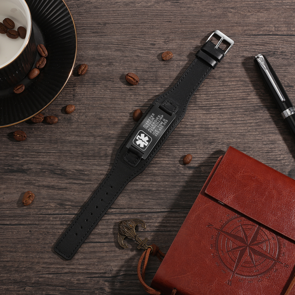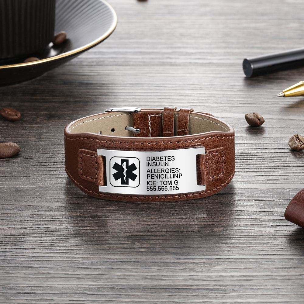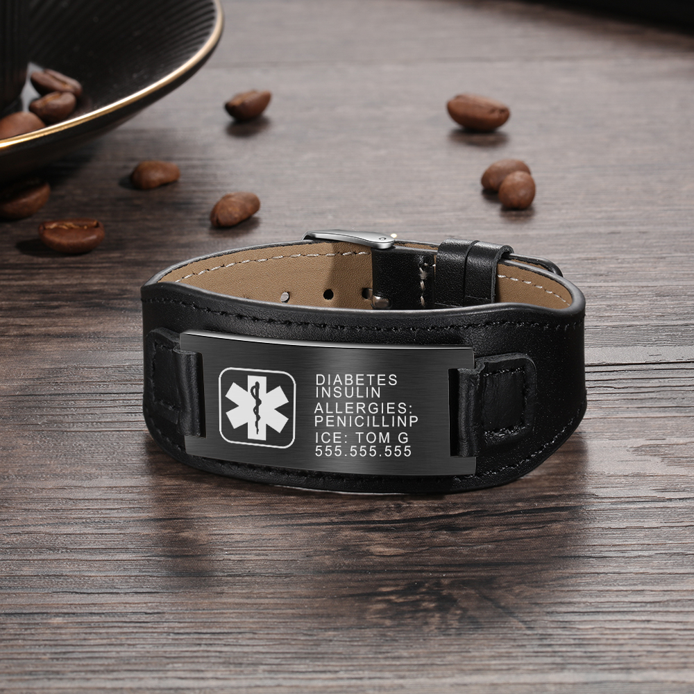 Personalized Leather Medical Alert Bracelet ID Wristbands Adjustable Custom Texts Emergency Bracelet