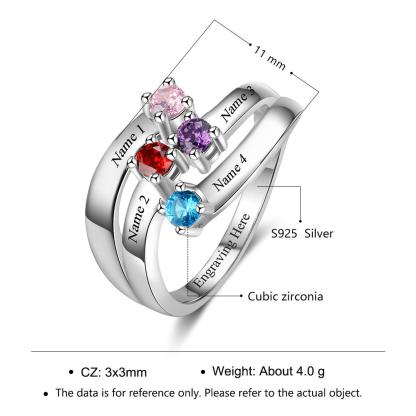 Personalized: Can choose 4 birthstones, engraving 4 names and a inside text on the Ring