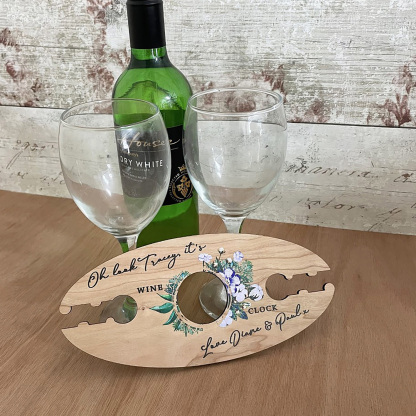 Our cleverly designed Wine Glass Caddies are crafted to hold most any size or shape of a wine bottle and standard wine glasses. They are supported personalized which means each one will be unique. It's an awesome gift and adds to any birthday, wedding, or engagement gift, add a name and personalize them!