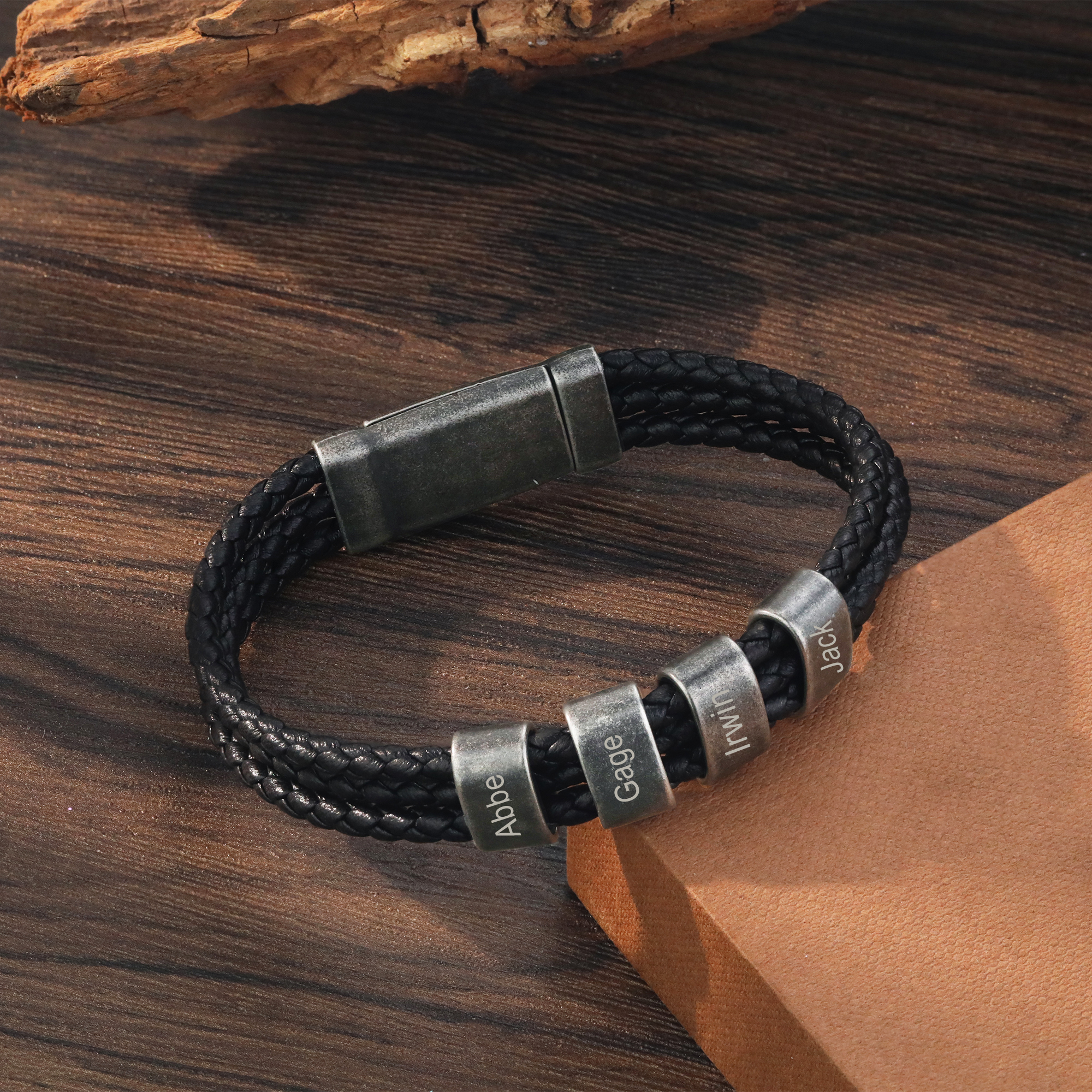 Personalized Men Leather Braided Bracelet Engraved 4 Names Three Layers Bracelet Vintage Gift For Him