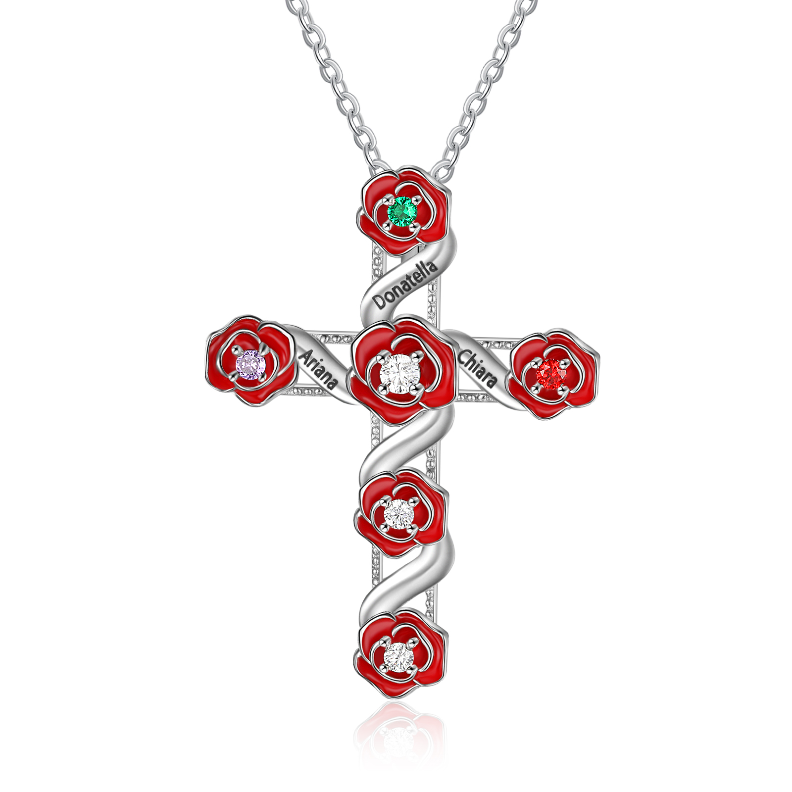 Personalized Rose Cross Necklace with 5 Birthstones Engraved Names for Her