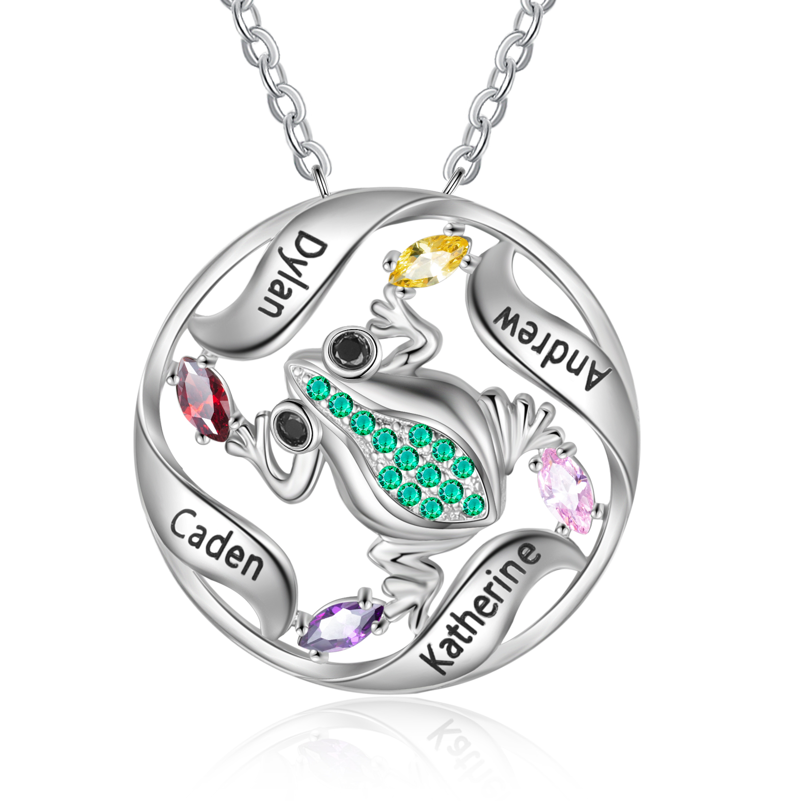 Personalized Frog Necklace with 4 Birthstones Engraved Names for Women