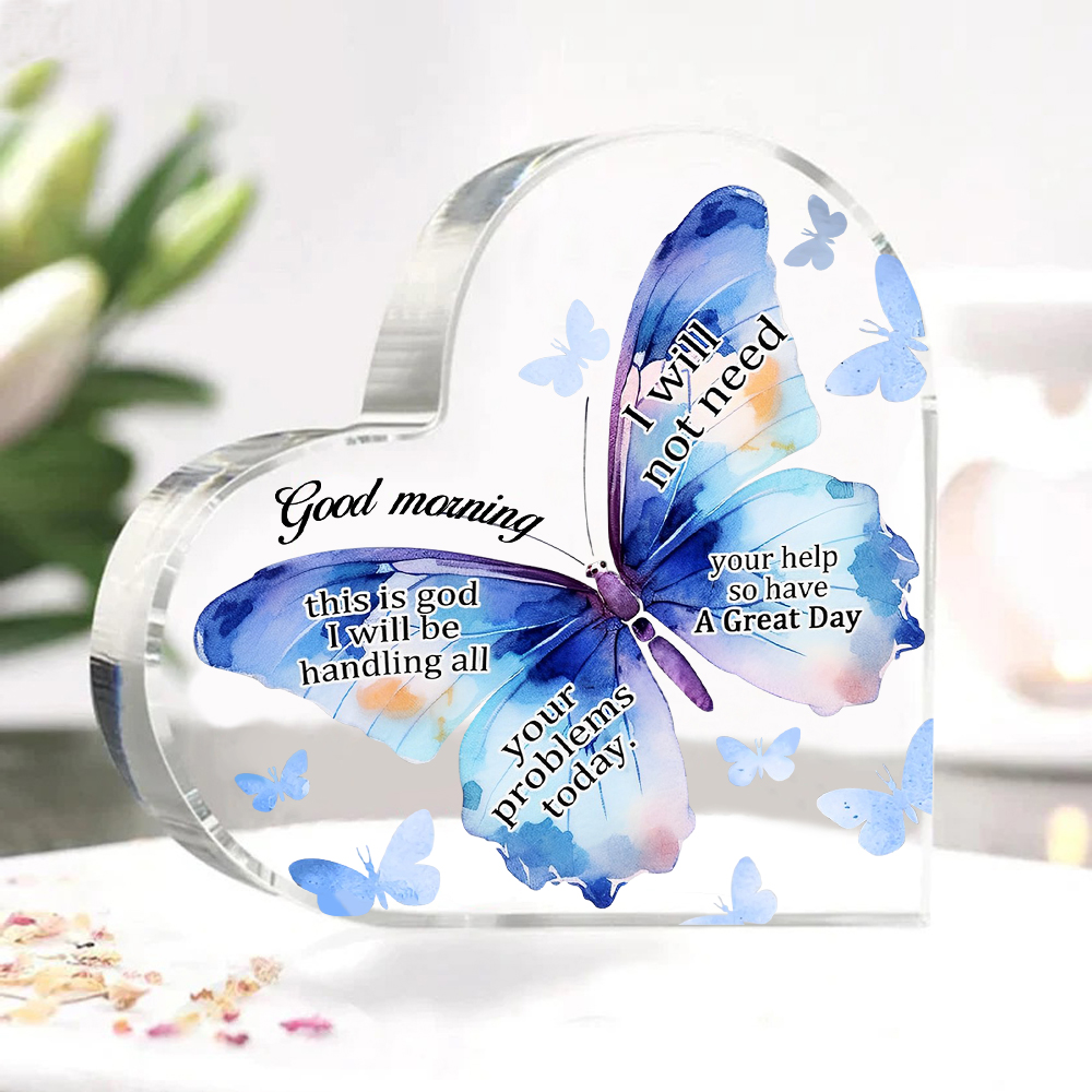 Acrylic Heart Keepsake with Butterfly - Good Morning This Is God I Will Be Handling All Your Problems Today