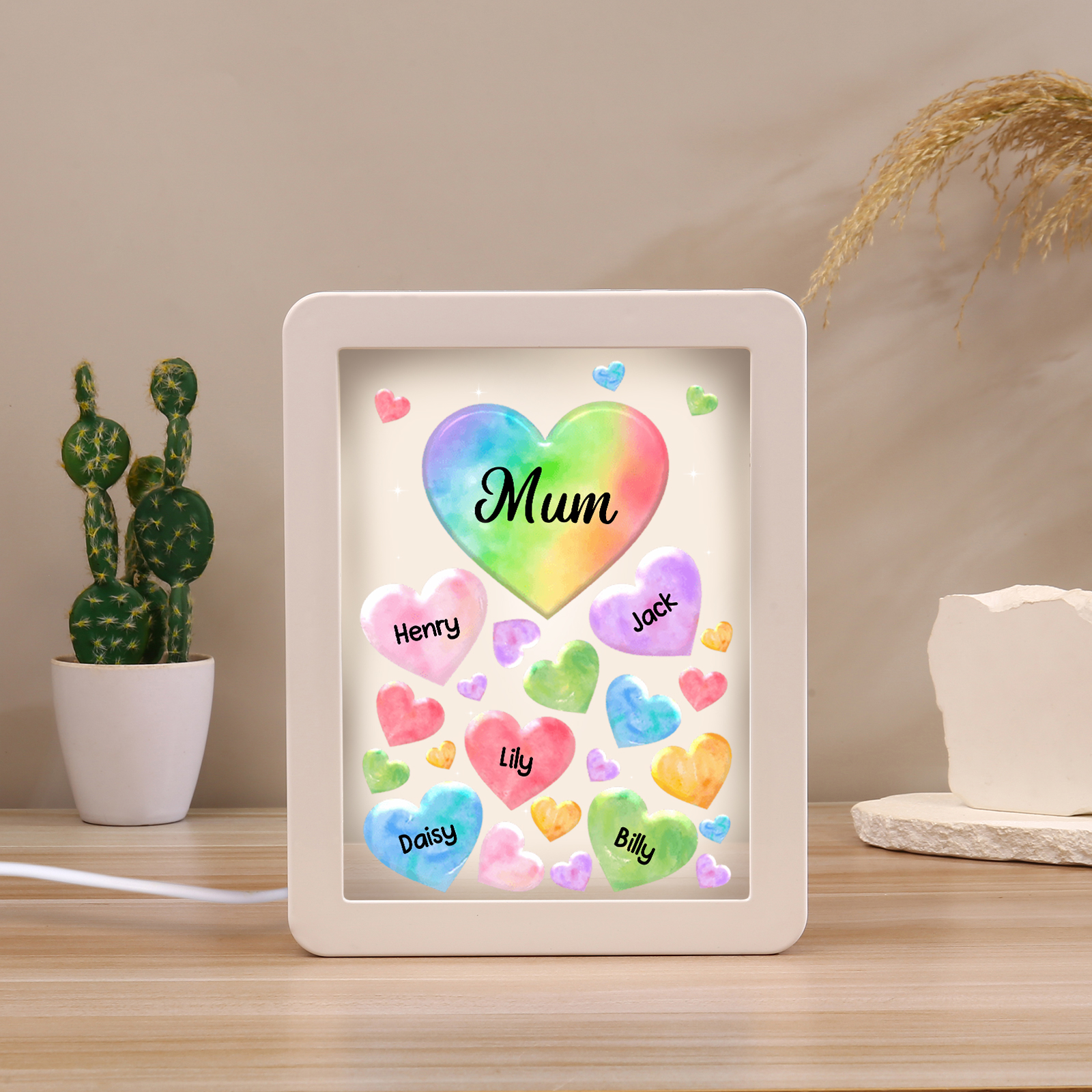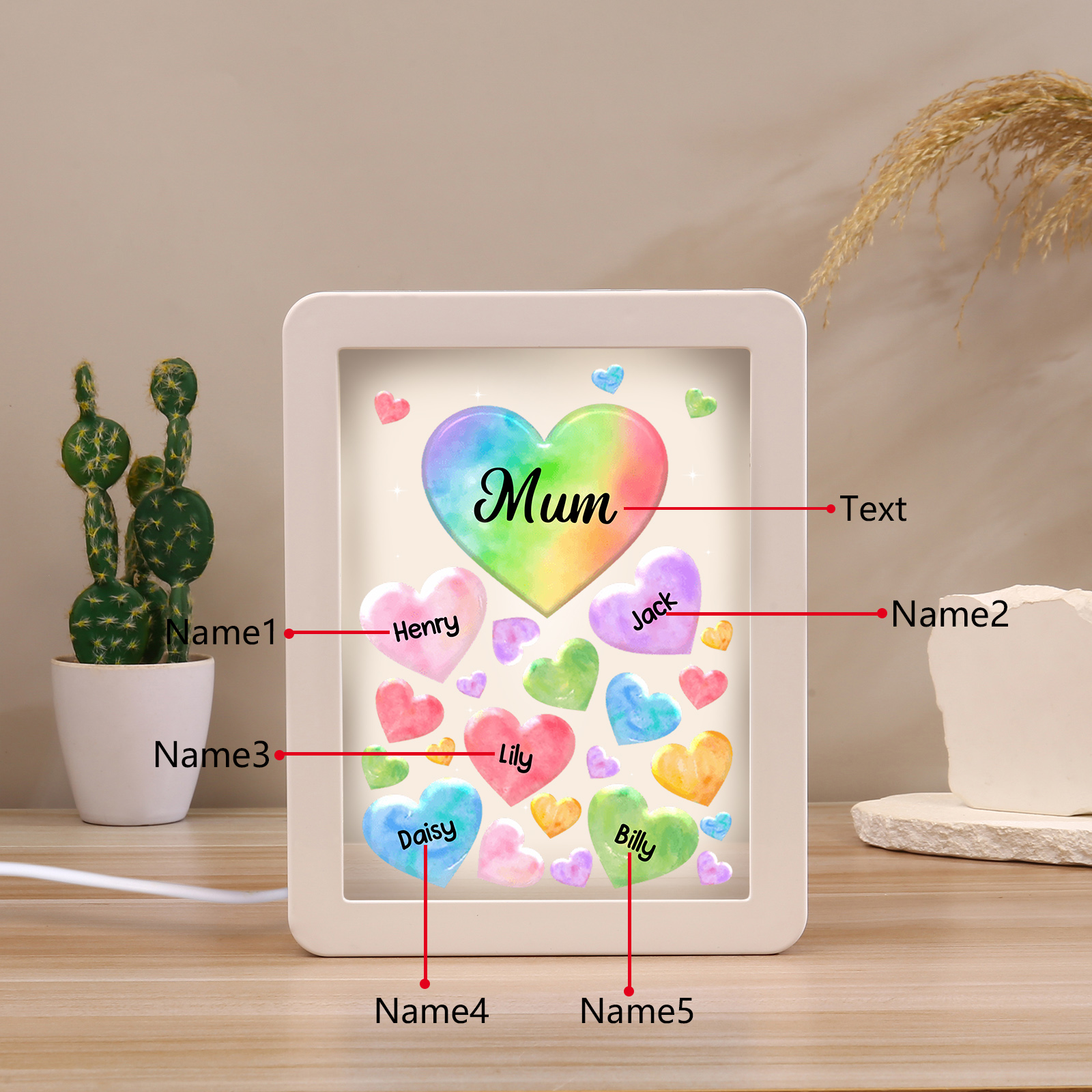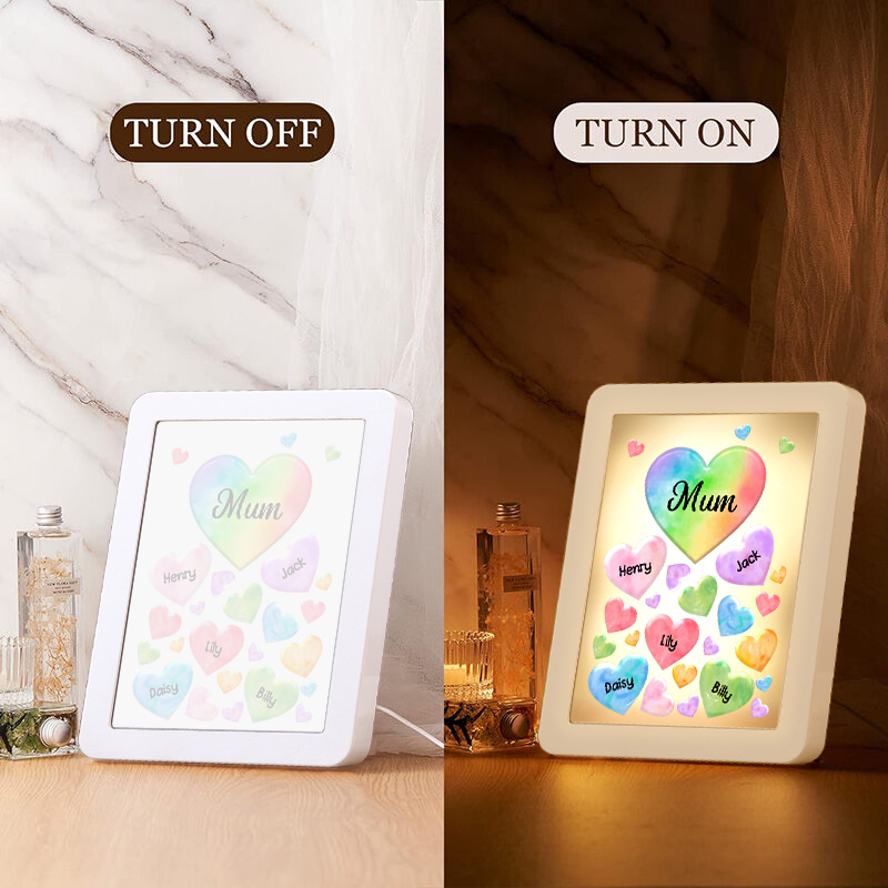 Personalized Night Light Mirror Frame Custom 1 Text & 5 Names Colorful Hearts Family LED Lamp Gift for Grandma/Mother