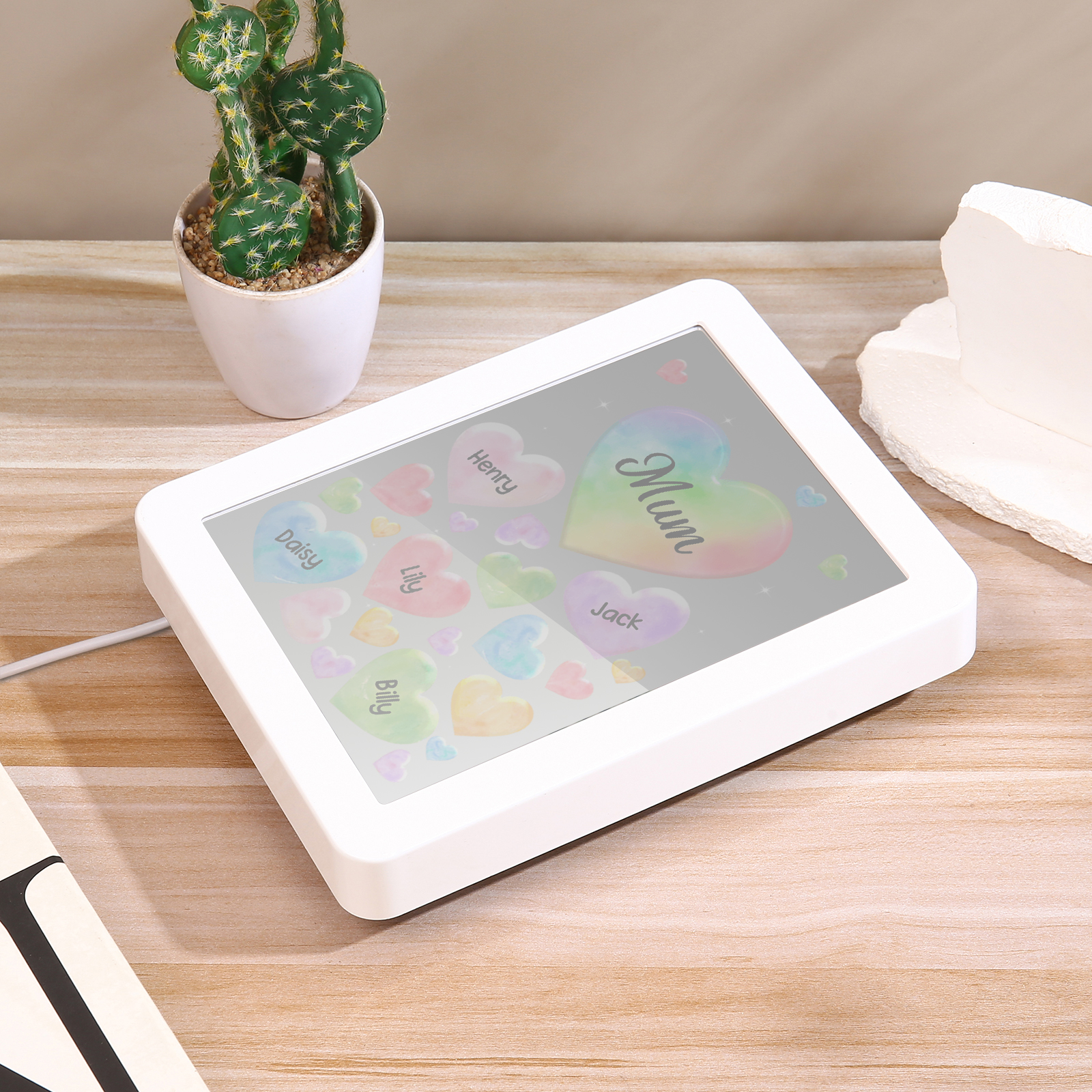 ✨ This multifunctional piece serves as a mirror during the day and transforms into a comforting night light adorned with an adorable colorful hearts design when powered on.