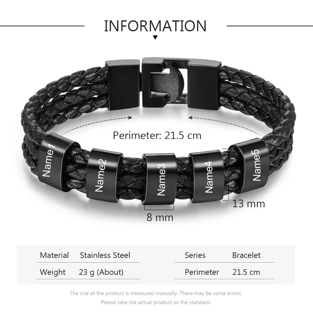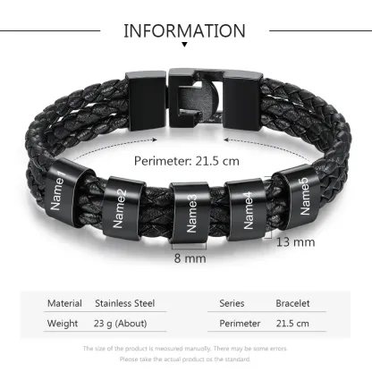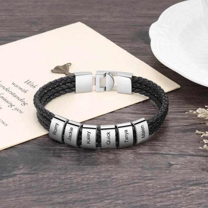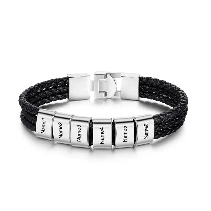 Men Leather Bracelet with 6 Beads Engraved 6 Names Three Layers Bracelet