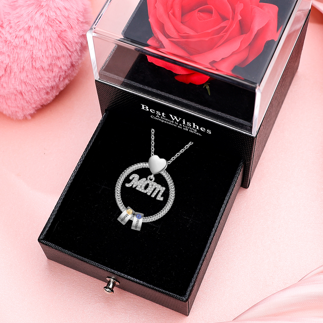 Personalized Rose Necklace with Birthstones Engraved 2 Names Intertwined Heart Pendant Necklace Gifts for Mother