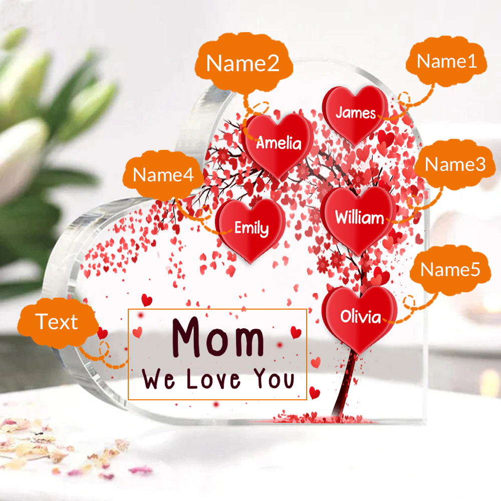 5 Names - Personalized Acrylic Heart Keepsake Custom Text Red Tree Ornaments Gifts for Grandma/Mother