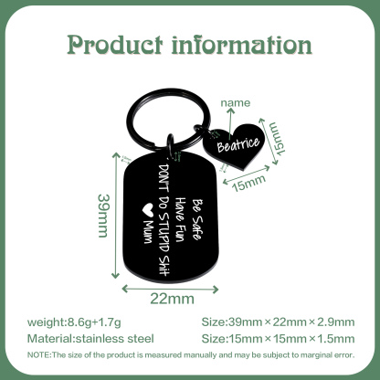 The "Don't do stupid shit" keychain is a funny gift for your kids on occasions like birthdays, graduation, anniversaries, Christmas, Thanksgiving, and more! This keychain will accompany them wherever they go, serving as a reminder that your support is unwavering. Not only is it functional and handy, but it also carries the heartfelt message of your love.