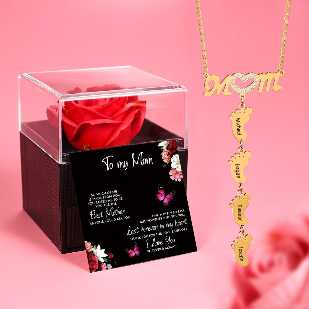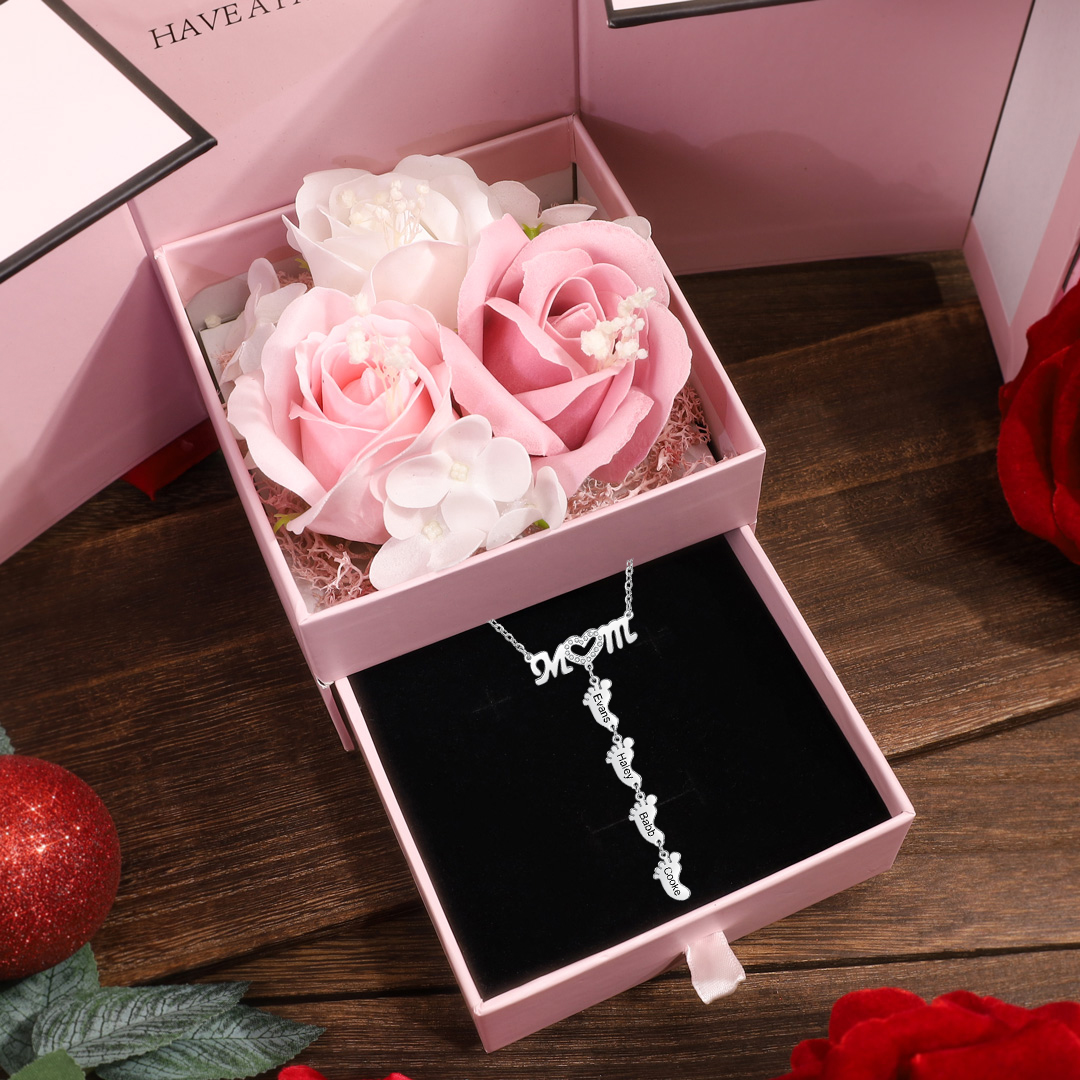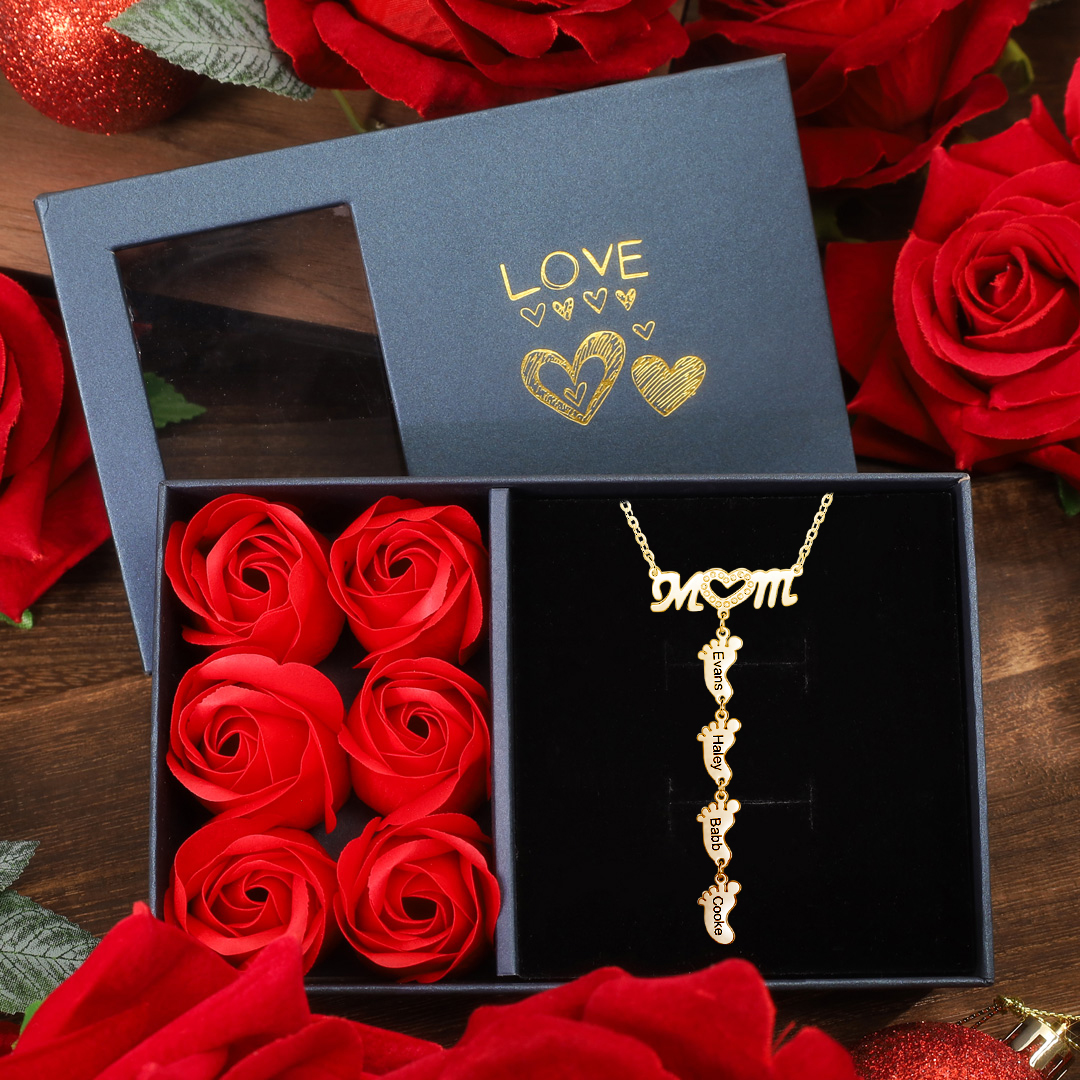 Mother Necklace with 4 Baby Feet Pendants Engraved 4 Names Rose Gift Set