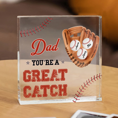 Personalized 3 Names & 1 Text Acrylic Square Keepsake Baseball Rectangle Plaque Gifts for Dad/Grandpa - You're A Great Catch